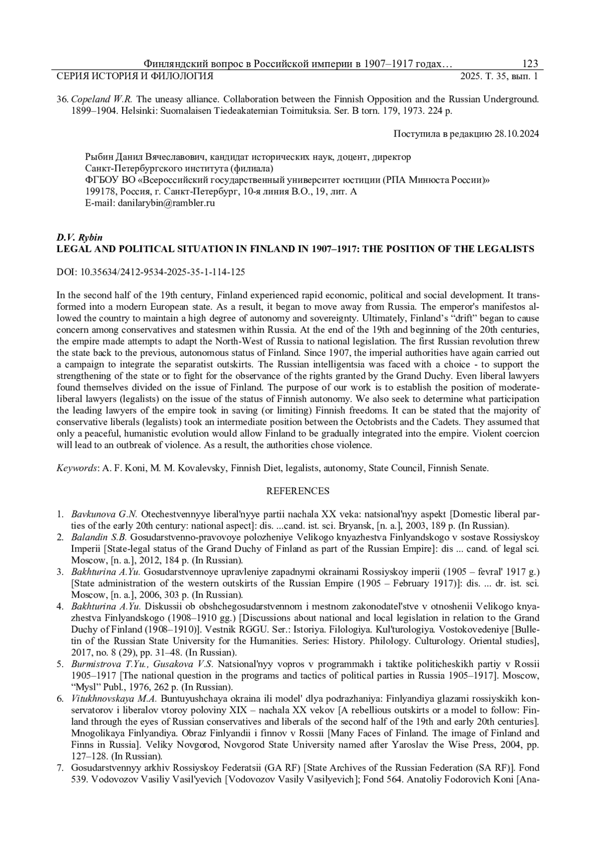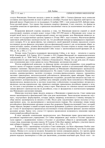 4. Бахтурина А.Ю. Дискуссии об общегосударственном и местном законодательстве в отношении Великого княжества Финляндского (1908-1910 гг.) // Вестник РГГУ. Сер.: История. Филология. Культурология. Востоковедение. 2017. № 8 (29). С. 31-48.