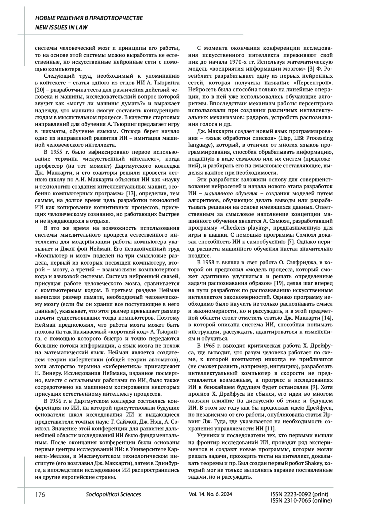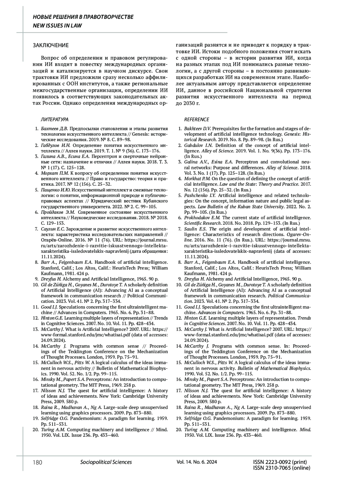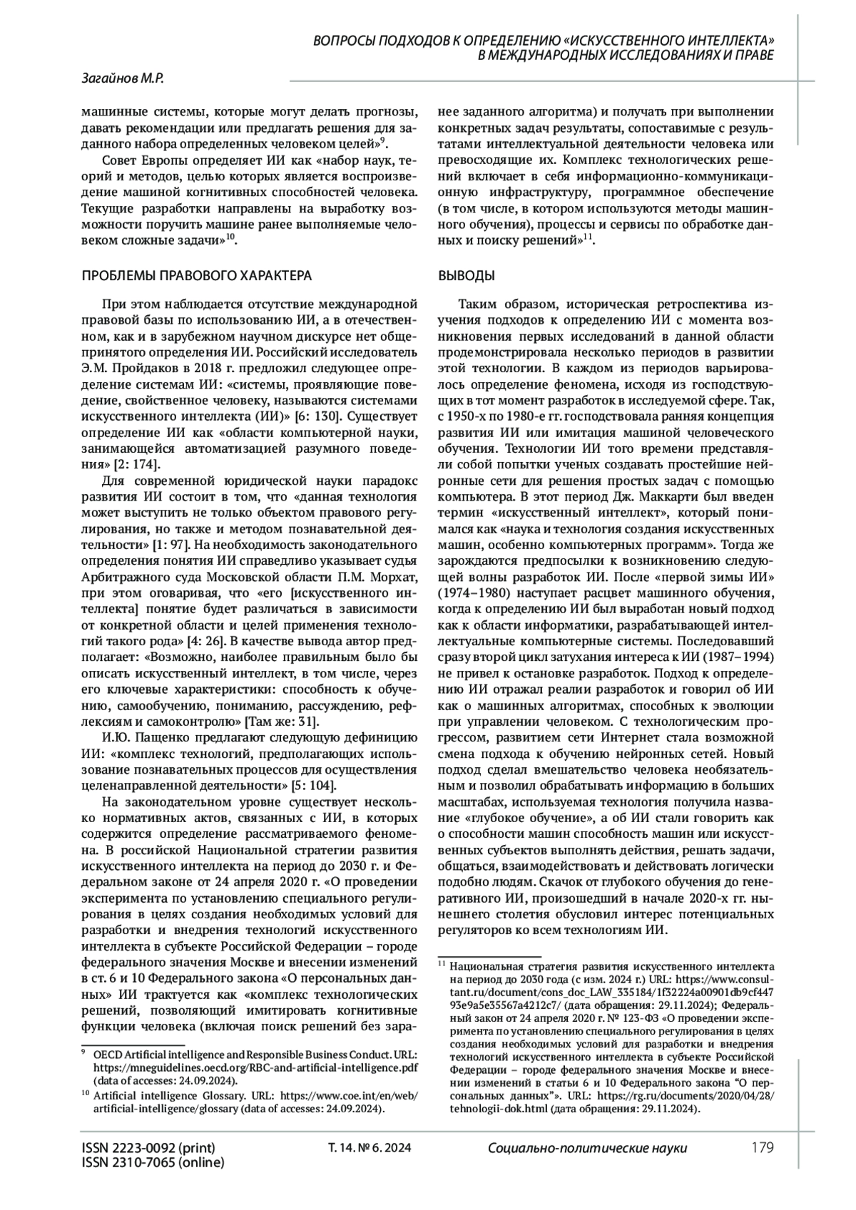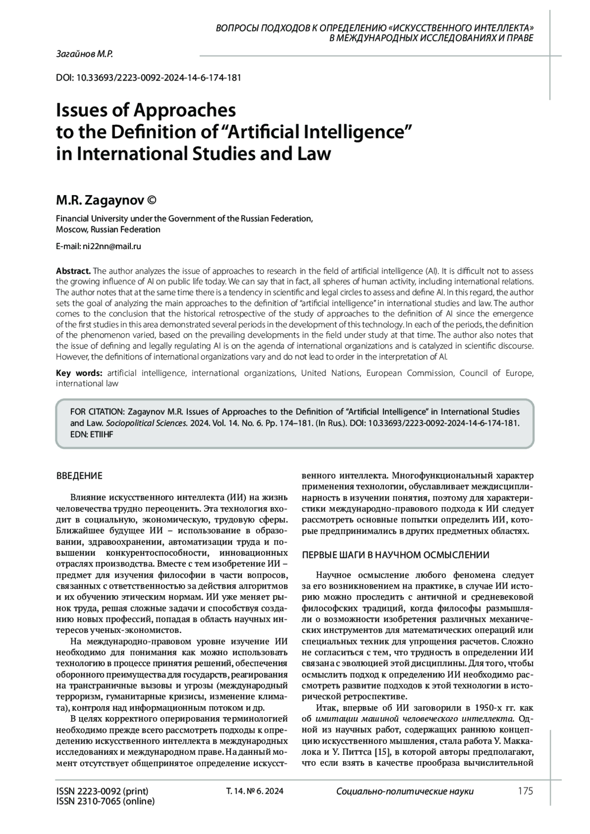 ЗАГАЙНОВ М. Р. ВОПРОСЫ ПОДХОДОВ К ОПРЕДЕЛЕНИЮ "ИСКУССТВЕННОГО ИНТЕЛЛЕКТА" В МЕЖДУНАРОДНЫХ ИССЛЕДОВАНИЯХ И ПРАВЕ // СОЦИАЛЬНО-ПОЛИТИЧЕСКИЕ НАУКИ. 2024. Т. 14 № 6