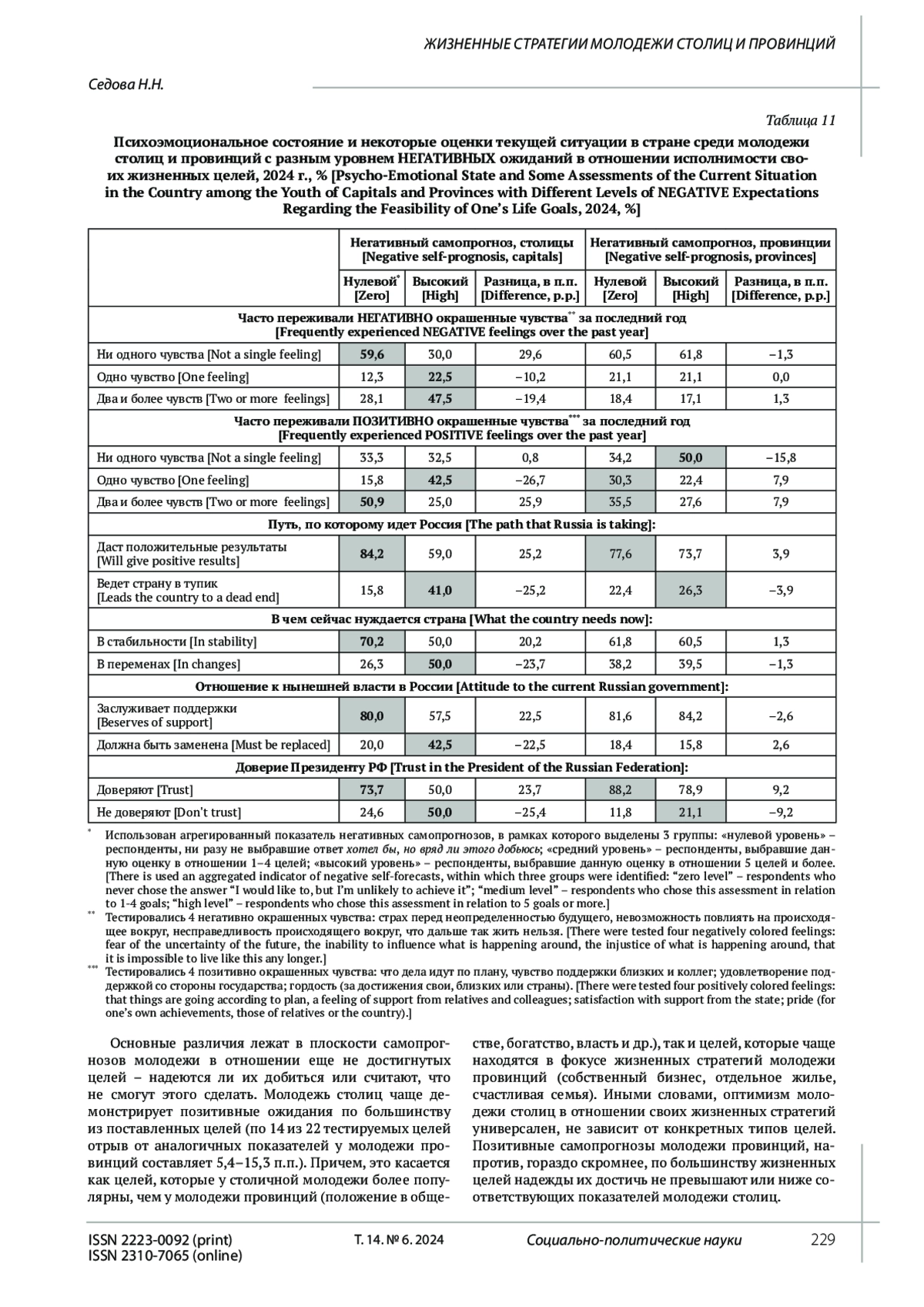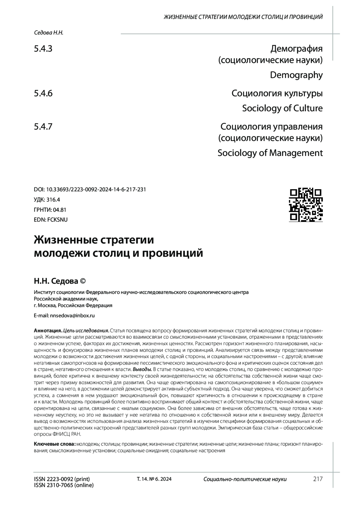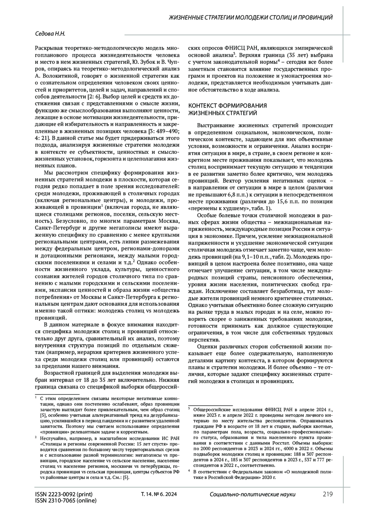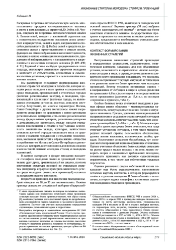 СЕДОВА Н. Н. ЖИЗНЕННЫЕ СТРАТЕГИИ МОЛОДЕЖИ СТОЛИЦ И ПРОВИНЦИЙ // СОЦИАЛЬНО-ПОЛИТИЧЕСКИЕ НАУКИ. 2024. Т. 14 № 6