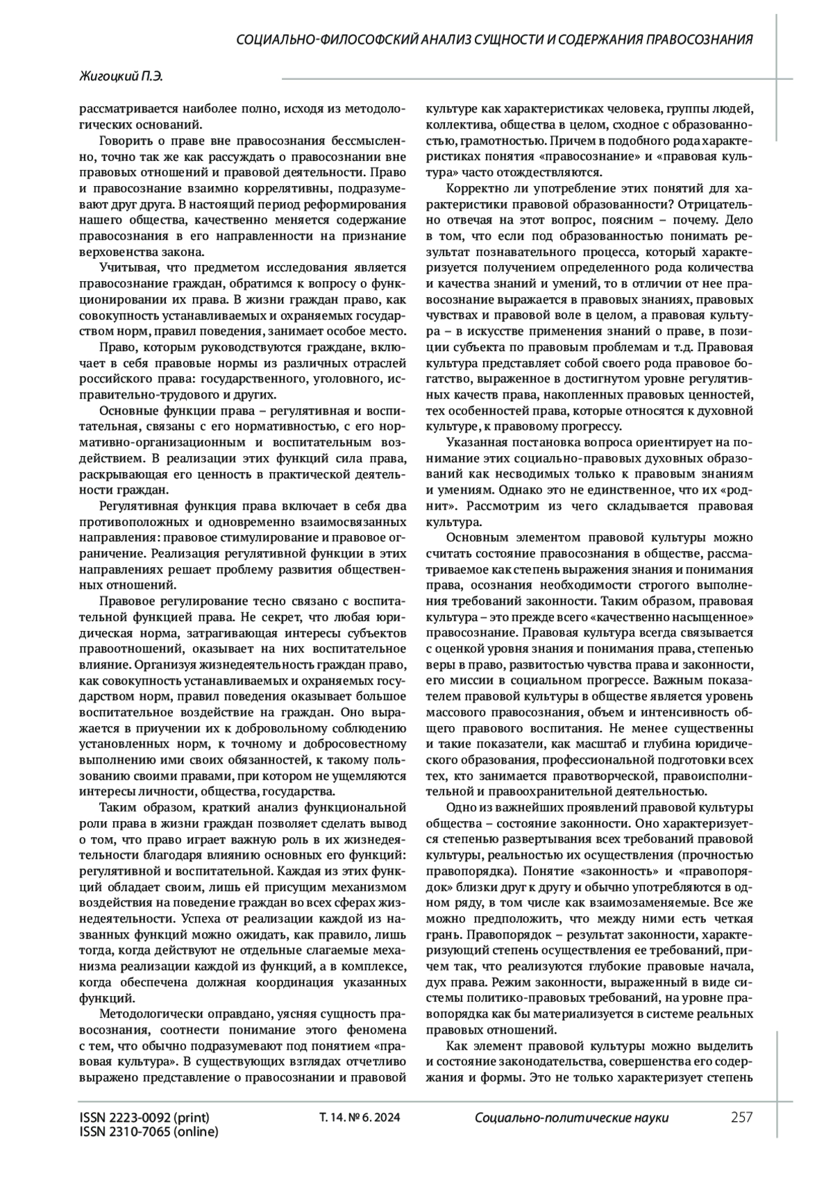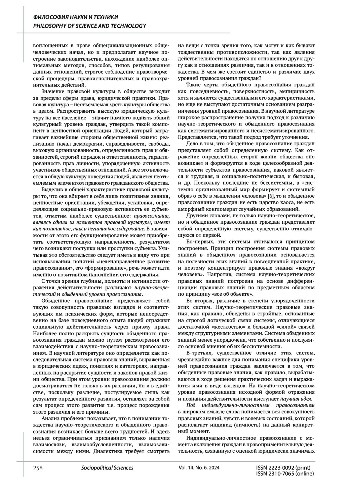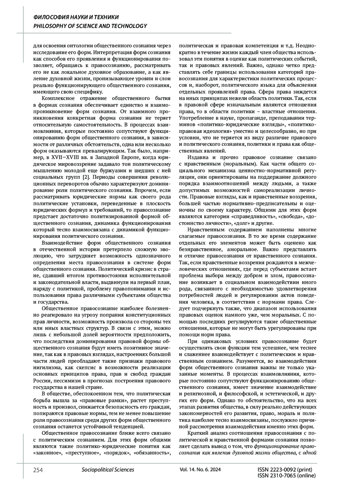 Предлагаемая статья знакомит читателя с социально-философским анализом сущности и содержания правосознания, которое является одним из важных элементов современной правовой системы Российской Федерации. Настоящая статья может быть использована, как научный материал в качестве рекомендации докторантам, аспирантам, слушателям и студентам, обучающимся по различным направлениям (специальностям) и изучающим дисциплины, содержащие вопросы истории и философии науки и теории государства и права, а также преподавателям и специалистам, работающим в области философии и юриспруденции.