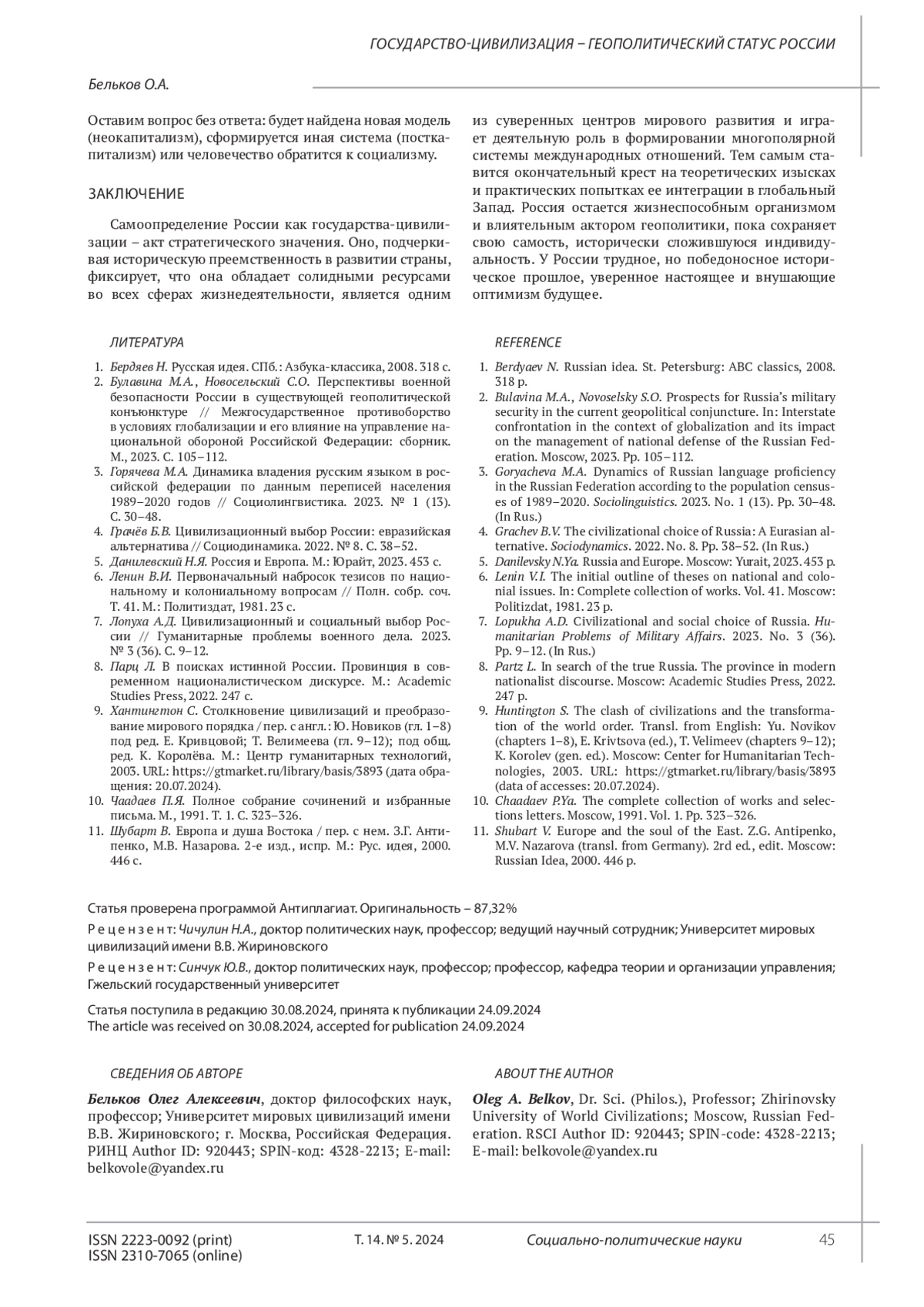 7. Лопуха А.Д. Цивилизационный и социальный выбор России // Гуманитарные проблемы военного дела. 2023. № 3 (36). С. 9-12. EDN: HELHUI