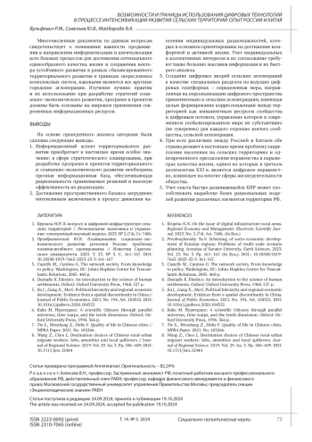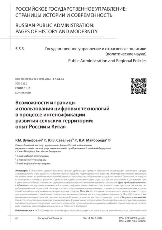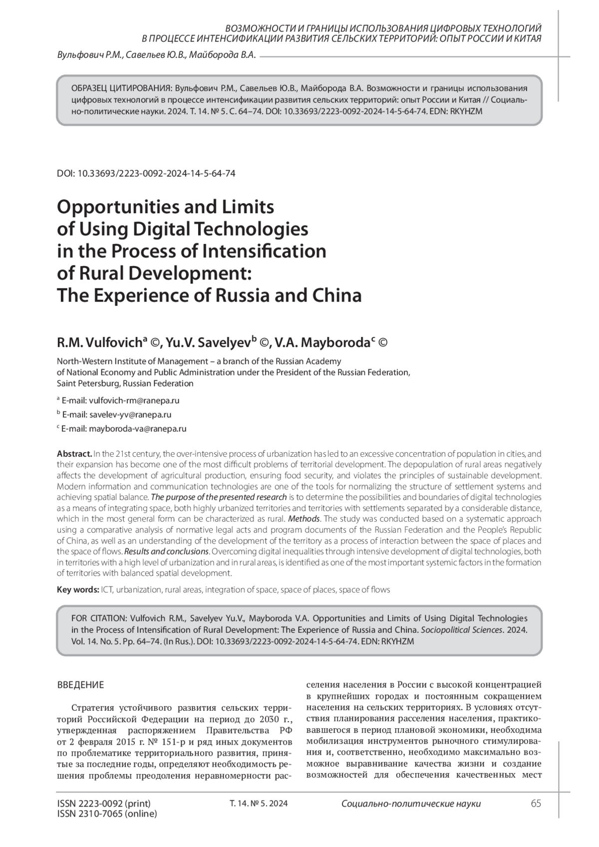 ВУЛЬФОВИЧ Р. М., САВЕЛЬЕВ Ю. В., МАЙБОРОДА В. А. ВОЗМОЖНОСТИ И ГРАНИЦЫ ИСПОЛЬЗОВАНИЯ ЦИФРОВЫХ ТЕХНОЛОГИЙ В ПРОЦЕССЕ ИНТЕНСИФИКАЦИИ РАЗВИТИЯ СЕЛЬСКИХ ТЕРРИТОРИЙ: ОПЫТ РОССИИ И КИТАЯ // СОЦИАЛЬНО-ПОЛИТИЧЕСКИЕ НАУКИ. 2024. Т. 14 № 5 (25 СТ.)