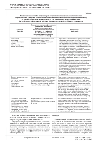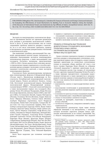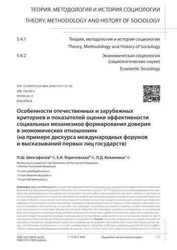 Статья: ОСОБЕННОСТИ ОТЕЧЕСТВЕННЫХ И ЗАРУБЕЖНЫХ КРИТЕРИЕВ И ПОКАЗАТЕЛЕЙ ОЦЕНКИ ЭФФЕКТИВНОСТИ СОЦИАЛЬНЫХ МЕХАНИЗМОВ ФОРМИРОВАНИЯ ДОВЕРИЯ В ЭКОНОМИЧЕСКИХ ОТНОШЕНИЯХ (НА ПРИМЕРЕ ДИСКУРСА МЕЖДУНАРОДНЫХ ФОРУМОВ И ВЫСКАЗЫВАНИЙ ПЕРВЫХ ЛИЦ ГОСУДАРСТВ) (2024)
