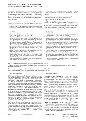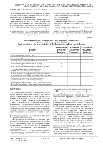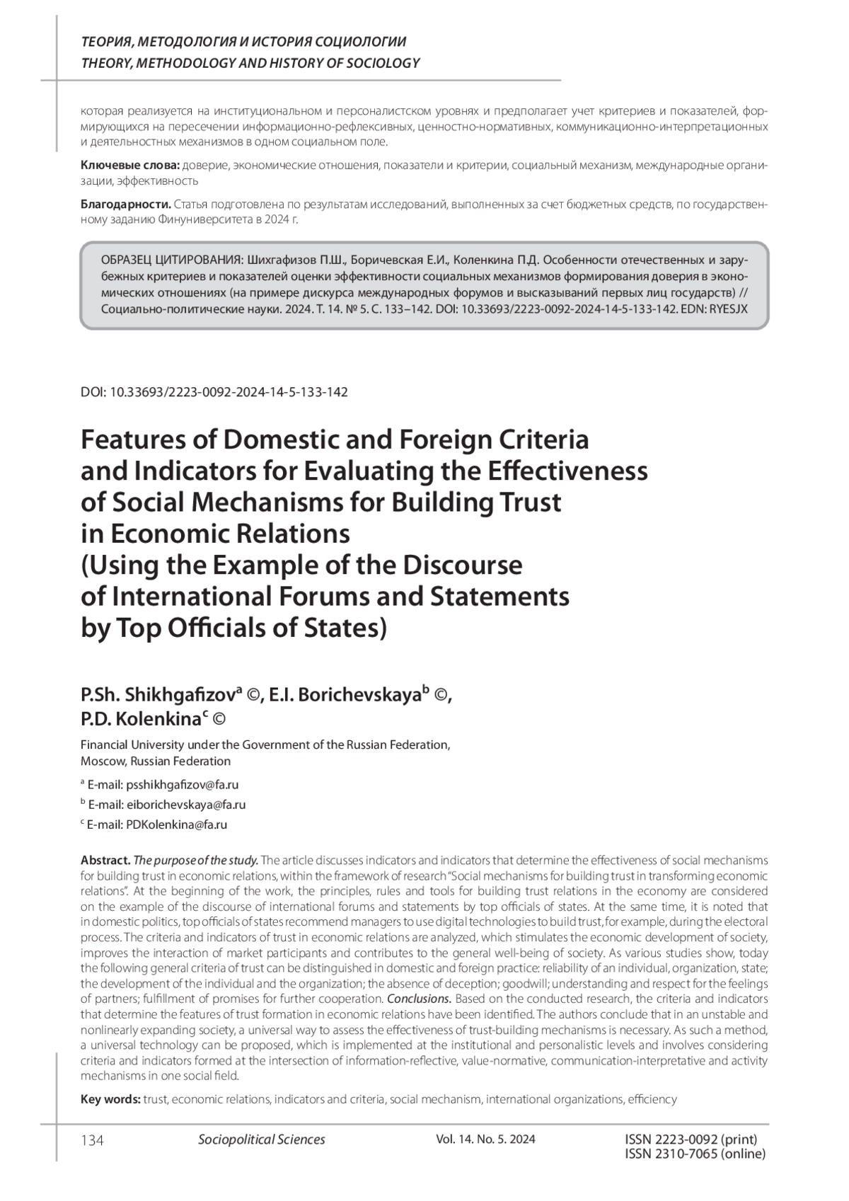 ШИХГАФИЗОВ П. Ш., БОРИЧЕВСКАЯ Е. И., КОЛЕНКИНА П. Д. ОСОБЕННОСТИ ОТЕЧЕСТВЕННЫХ И ЗАРУБЕЖНЫХ КРИТЕРИЕВ И ПОКАЗАТЕЛЕЙ ОЦЕНКИ ЭФФЕКТИВНОСТИ СОЦИАЛЬНЫХ МЕХАНИЗМОВ ФОРМИРОВАНИЯ ДОВЕРИЯ В ЭКОНОМИЧЕСКИХ ОТНОШЕНИЯХ (НА ПРИМЕРЕ ДИСКУРСА МЕЖДУНАРОДНЫХ ФОРУМОВ И ВЫСКАЗЫВАНИЙ ПЕРВЫХ ЛИЦ ГОСУДАРСТВ) // СОЦИАЛЬНО-ПОЛИТИЧЕСКИЕ НАУКИ. 2024. Т. 14 № 5 (25 СТ.)