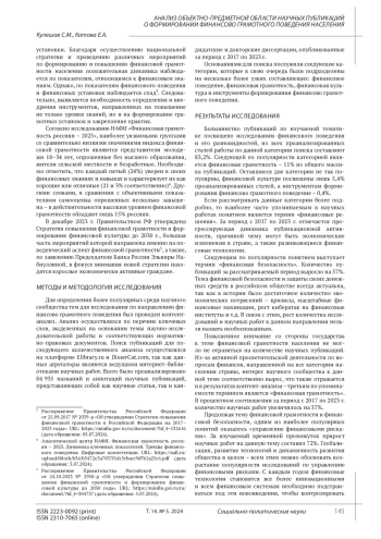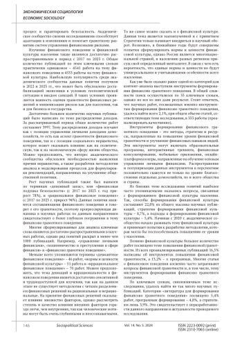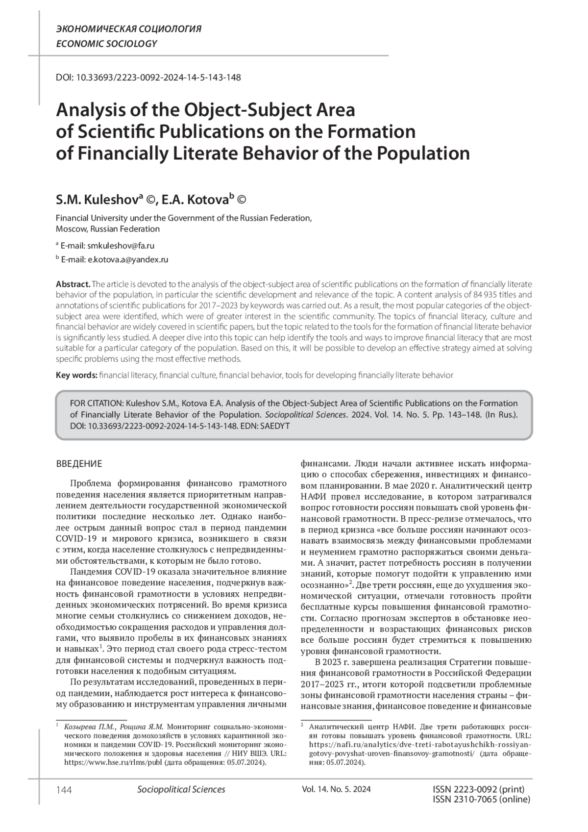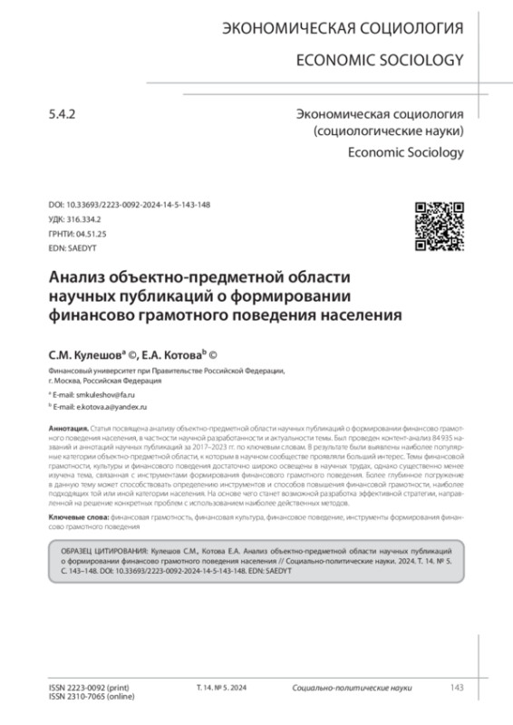 Статья посвящена анализу объектно-предметной области научных публикаций о формировании финансово грамотного поведения населения, в частности научной разработанности и актуальности темы. Был проведен контент-анализ 84 935 названий и аннотаций научных публикаций за 2017-2023 гг. по ключевым словам. В результате были выявлены наиболее популярные категории объектно-предметной области, к которым в научном сообществе проявляли больший интерес. Темы финансовой грамотности, культуры и финансового поведения достаточно широко освещены в научных трудах, однако существенно менее изучена тема, связанная с инструментами формирования финансового грамотного поведения. Более глубинное погружение в данную тему может способствовать определению инструментов и способов повышения финансовой грамотности, наиболее подходящих той или иной категории населения. На основе чего станет возможной разработка эффективной стратегии, направленной на решение конкретных проблем с использованием наиболее действенных методов.