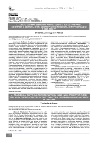 Введение. В публикации рассматривается деятельность Евпаторийской подпольной организации в годы Великой Отечественной войны. В отечественной историографии подполье Крыма, особенно г. Евпатории, до сих пор остается малоизученной темой.