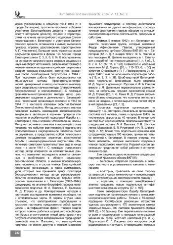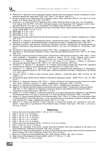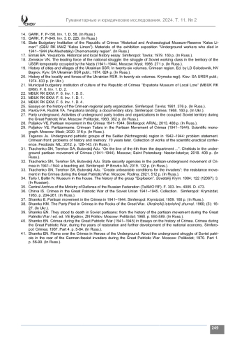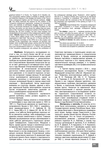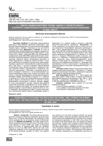 Материалы и методы. В статье на основании ранее неопубликованных источников из фондов Государственного архива Республики Крым (ГАРК), архива г. Севастополя (АГС), архива г. Евпатории (МБУ АГЕ), Евпаторийского краеведческого музея (МБУ ЕКМ) развенчивается миф о незначительном вкладе евпаторийских патриотов в разгром немецкорумынских оккупантов Крыма. Исследование выполнено на основе общенаучных и специально научных методов. С помощью сравнительно-исторического метода автор рассматривает создание и деятельность Евпаторийской подпольной организации в 1942–1944 гг. в контексте ключевых событий Великой Отечественной войны. Методы системного и диахронного анализа позволяют выявить закономерности и особенности деятельности подпольщиков г. Евпатории. Статический метод помогает исследовать численность и состав Евпаторийской подпольной организации, оценить урон, который она нанесла оккупантам. С помощью биографического метода реконструируются биографии лидеров евпаторийского подполья: Ф. А. Павлова, Я. Цыпкина, М. Д. Глушко и др. Компаративный метод позволяет выявить общие и отличительные черты в стратегии и тактики евпаторийских подпольщиков и крымских партизан.