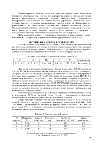 Ключевые фразы: конструкционная сталь, ЛАЗЕРНАЯ ЗАКАЛКА, многоканальный лазер, микроструктура, мартенсит, микротвердость