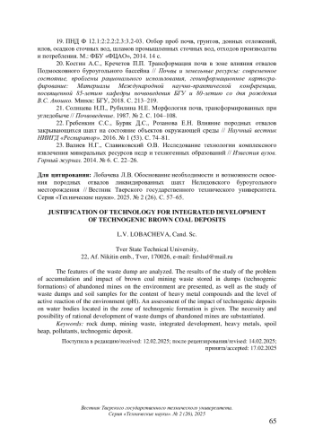 15. Лобачева Л.В., Левинский В.В. Исследование воздействия отходов добычи бурого угля на окружающую среду // Экология и безопасность жизнедеятельности: Сборник статей XXIII Международной научно-практической конференции / ред.: В.А. Селезнев, И.А. Лушкин. Пенза: Пензенский ГАУ, 2023. С. 236-239. EDN: TNLJGS