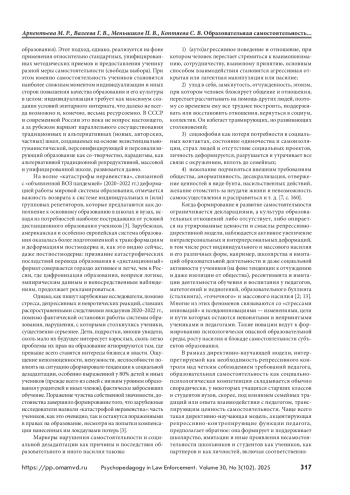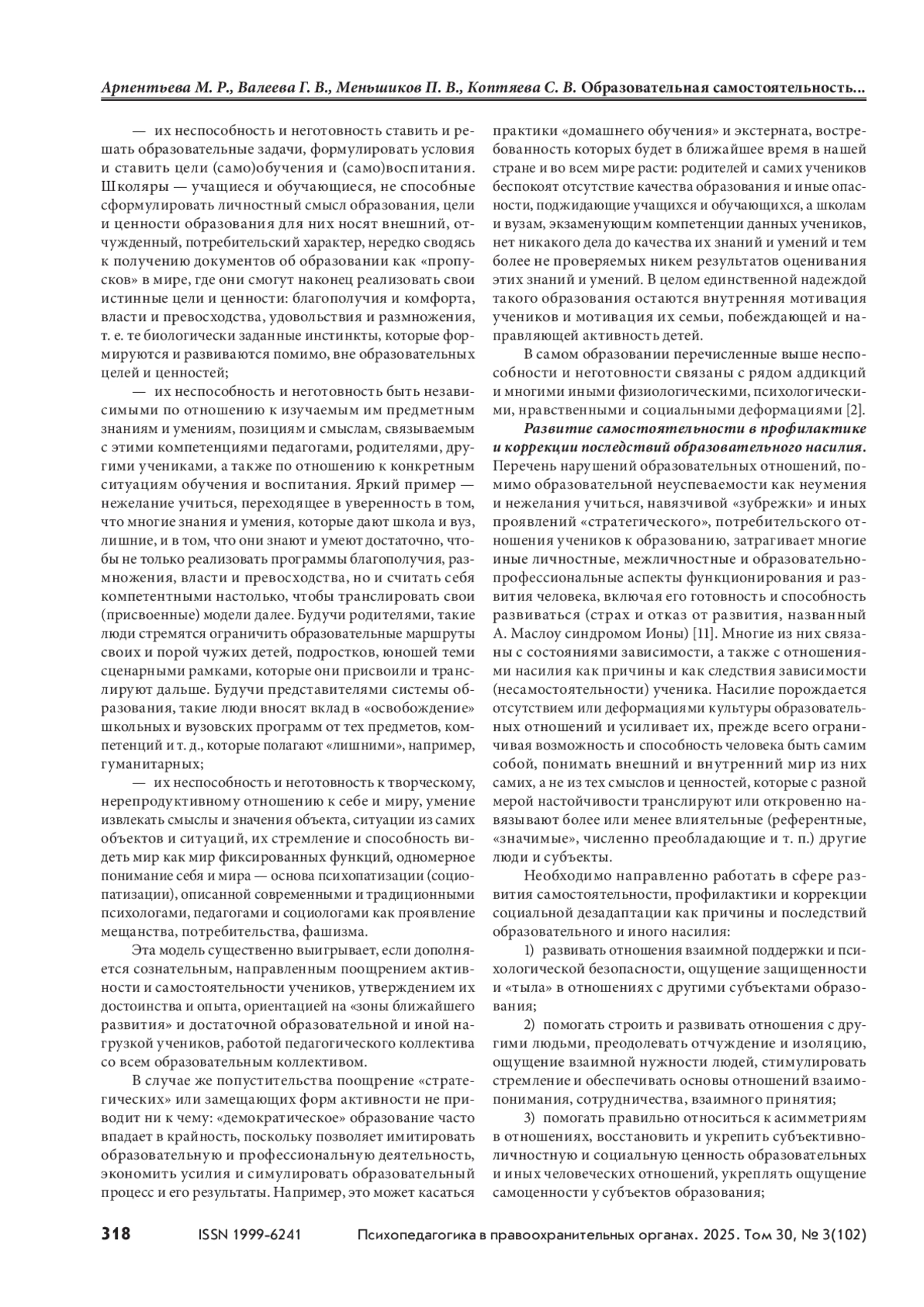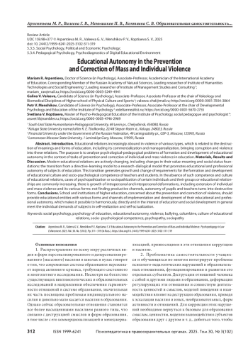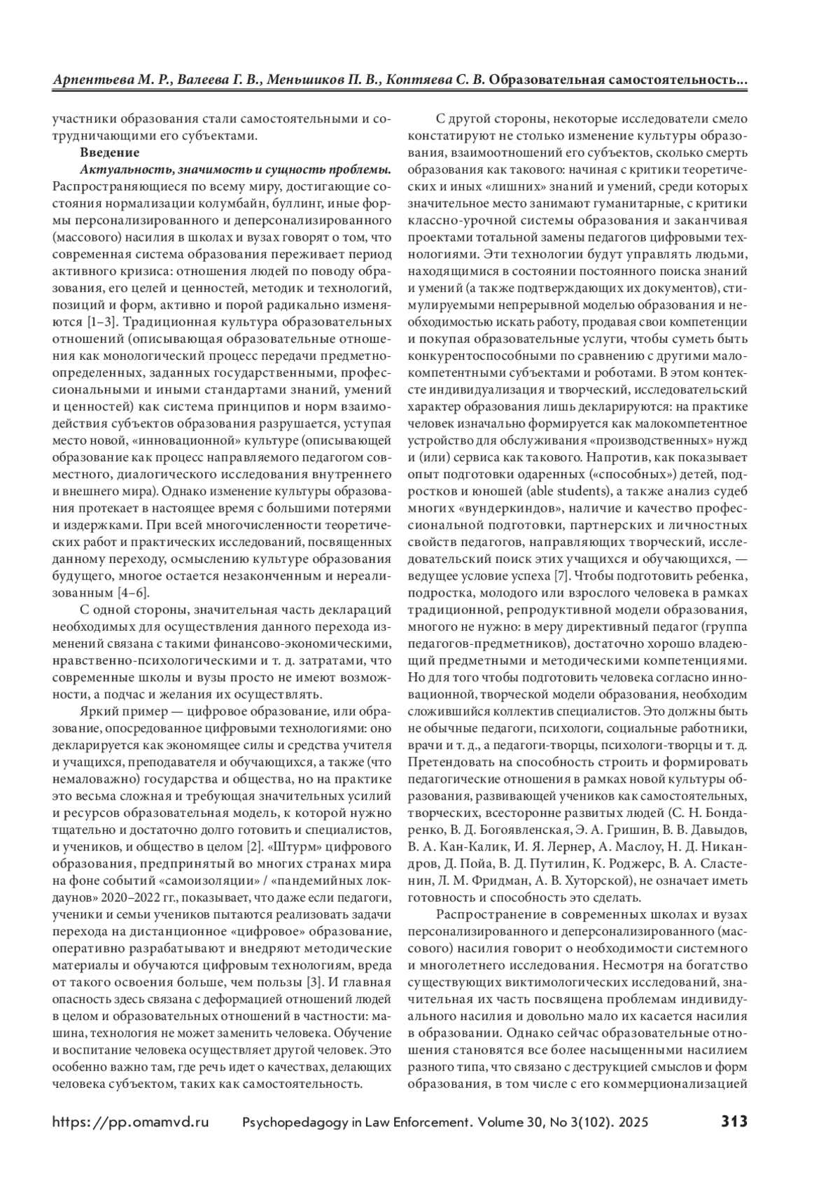 АРПЕНТЬЕВА М. Р., ВАЛЕЕВА Г. В., МЕНЬШИКОВ П. В., КОПТЯЕВА С. В. ОБРАЗОВАТЕЛЬНАЯ САМОСТОЯТЕЛЬНОСТЬ В ПРОФИЛАКТИКЕ И КОРРЕКЦИИ МАССОВОГО И ИНДИВИДУАЛЬНОГО НАСИЛИЯ // ПСИХОПЕДАГОГИКА В ПРАВООХРАНИТЕЛЬНЫХ ОРГАНАХ. 2025. № 3 (102), ТОМ 30