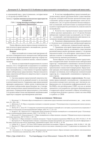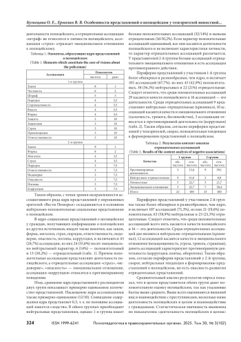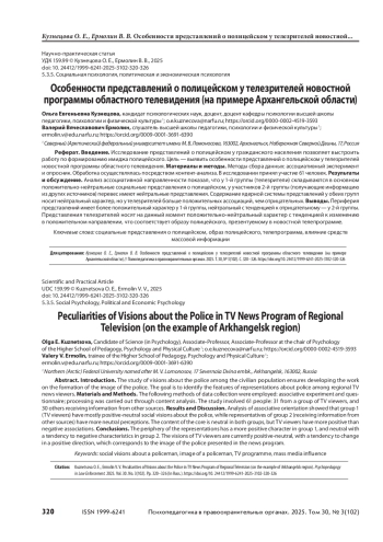 Исследование представлений о полицейском у гражданского населения позволяет выстроить работу по формированию имиджа полицейского. Цель — выявить особенности представлений о полицейском у телезрителей новостной программы областного телевидения. Материалы и методы. Методы сбора данных: ассоциативный эксперимент и опросник. Обработка осуществлялась посредством контент-анализа. В исследовании принял участие 61 человек. Результаты и обсуждение. Анализ ассоциативной направленности показал, что у 1-й группы (телезрители) складываются в основном положительно-нейтральные социальные представления о полицейском, у участников 2-й группы (получающие информацию из других источников) перевес имеют нейтральные представления. Содержание ядерной системы представлений у обеих групп носит нейтральный характер, но у телезрителей больше положительных ассоциаций, чем отрицательных. Выводы. Периферия представлений имеет более положительный характер у 1-й группы, нейтральный с тенденцией к отрицательному — у 2-й группы. Представления телезрителей носят на данный момент положительно-нейтральный характер с тенденцией к изменению в положительном направлении, что соответствует образу полицейского, презентуемому в новостной телепрограмме.