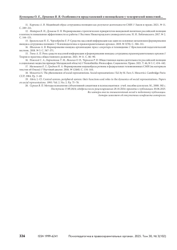 10. Золотайко А. И., Нестерова В. Е. Моделирование положительного образа полиции в российских оппозиционных газетах // Политическая лингвистика. 2022. № 2(92). С. 92–99.