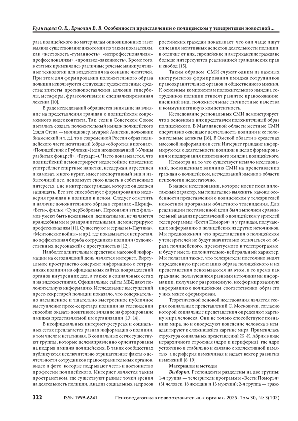 4. Базаров Т. Ю., Черкасов В. В. Социальные представления об имидже полицейского в молодежной среде // Психопедагогика в правоохранительных органах. 2019. Т. 24, № 1(76). С. 14–21.