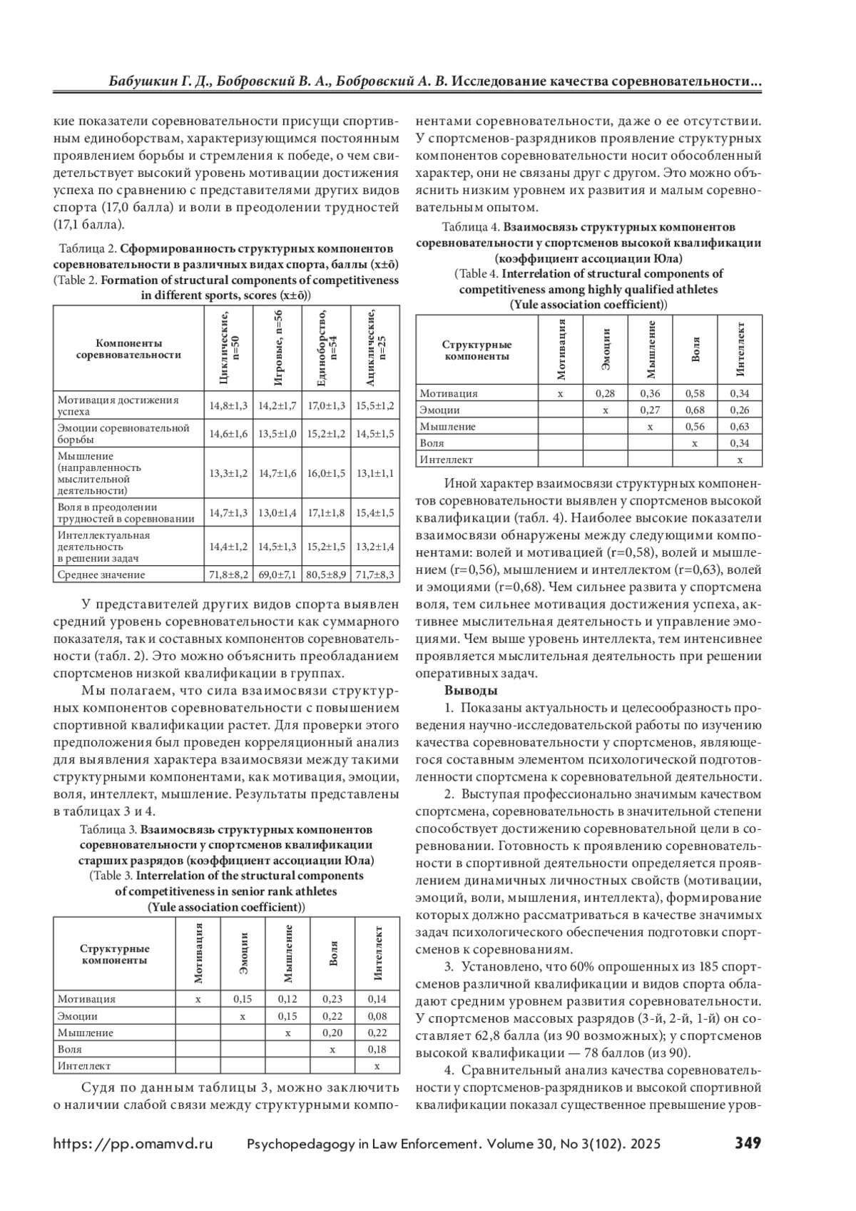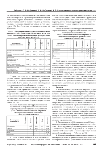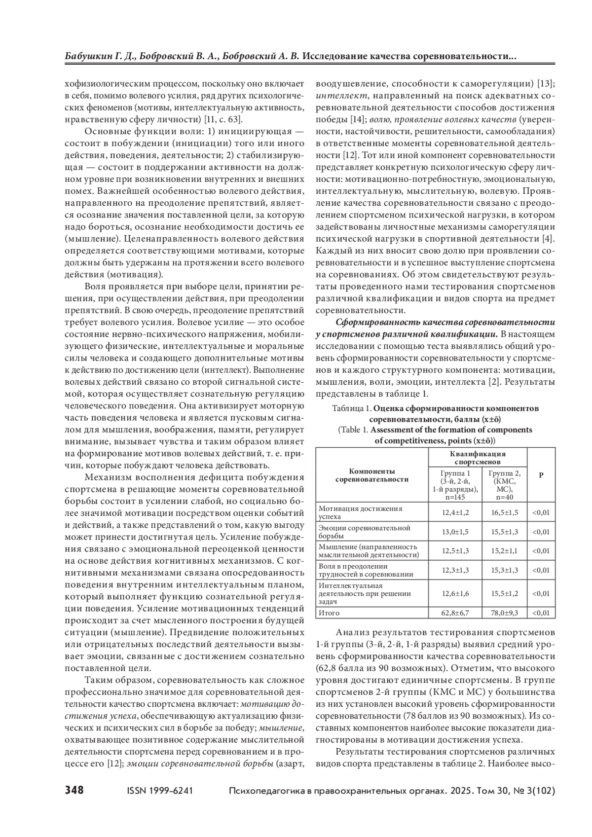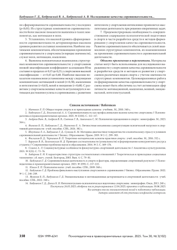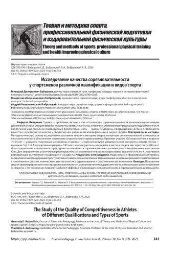 БАБУШКИН Г. Д., БОБРОВСКИЙ В. А., БОБРОВСКИЙ А. В. ИССЛЕДОВАНИЕ КАЧЕСТВА СОРЕВНОВАТЕЛЬНОСТИ У СПОРТСМЕНОВ РАЗЛИЧНОЙ КВАЛИФИКАЦИИ И ВИДОВ СПОРТА // ПСИХОПЕДАГОГИКА В ПРАВООХРАНИТЕЛЬНЫХ ОРГАНАХ. 2025. № 3 (102), ТОМ 30