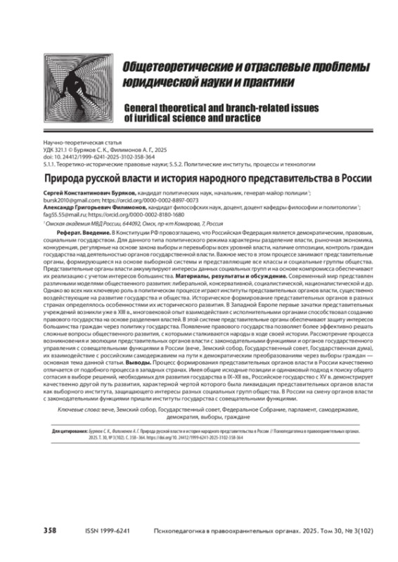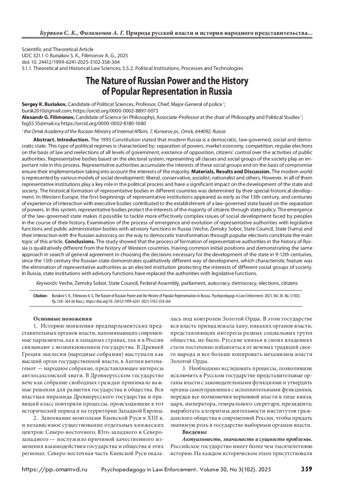 В Конституции РФ провозглашено, что Российская Федерация является демократическим, правовым, социальным государством. Для данного типа политического режима характерны разделение власти, рыночная экономика, конкуренция, регулярные на основе закона выборы и перевыборы всех уровней власти, наличие оппозиции, контроль граждан государства над деятельностью органов государственной власти. Важное место в этом процессе занимают представительные органы, формирующиеся на основе выборной системы и представляющие все классы и социальные группы общества. Представительные органы власти аккумулируют интересы данных социальных групп и на основе компромисса обеспечивают их реализацию с учетом интересов большинства. Материалы, результаты и обсуждение. Современный мир представлен различными моделями общественного развития: либеральной, консервативной, социалистической, националистической и др. Однако во всех них ключевую роль в политическом процессе играют институты представительных органов власти, существенно воздействующие на развитие государства и общества. Историческое формирование представительных органов в разных странах определялось особенностями их исторического развития. В Западной Европе первые зачатки представительных учреждений возникли уже в XIII в., многовековой опыт взаимодействия с исполнительными органами способствовал созданию правового государства на основе разделения властей. В этой системе представительные органы обеспечивают защиту интересов большинства граждан через политику государства. Появление правового государства позволяет более эффективно решать сложные вопросы общественного развития, с которыми сталкиваются народы в ходе своей истории. Рассмотрение процесса возникновения и эволюции представительных органов власти с законодательными функциями и органов государственного управления с совещательными функциями в России (вече, Земский собор, Государственный совет, Государственная дума), их взаимодействие с российским самодержавием на пути к демократическим преобразованиям через выборы граждан — основная тема данной статьи. Выводы. Процесс формирования представительных органов власти в России качественно отличается от подобного процесса в западных странах. Имея общие исходные позиции и одинаковый подход к поиску общего согласия в выборе решений, необходимых для развития государства в IX–XII вв., Российское государство с XV в. демонстрирует качественно другой путь развития, характерной чертой которого была ликвидация представительных органов власти как выборного института, защищающего интересы разных социальных групп общества. В России на смену органов власти с законодательными функциями пришли институты государства с совещательными функциями.