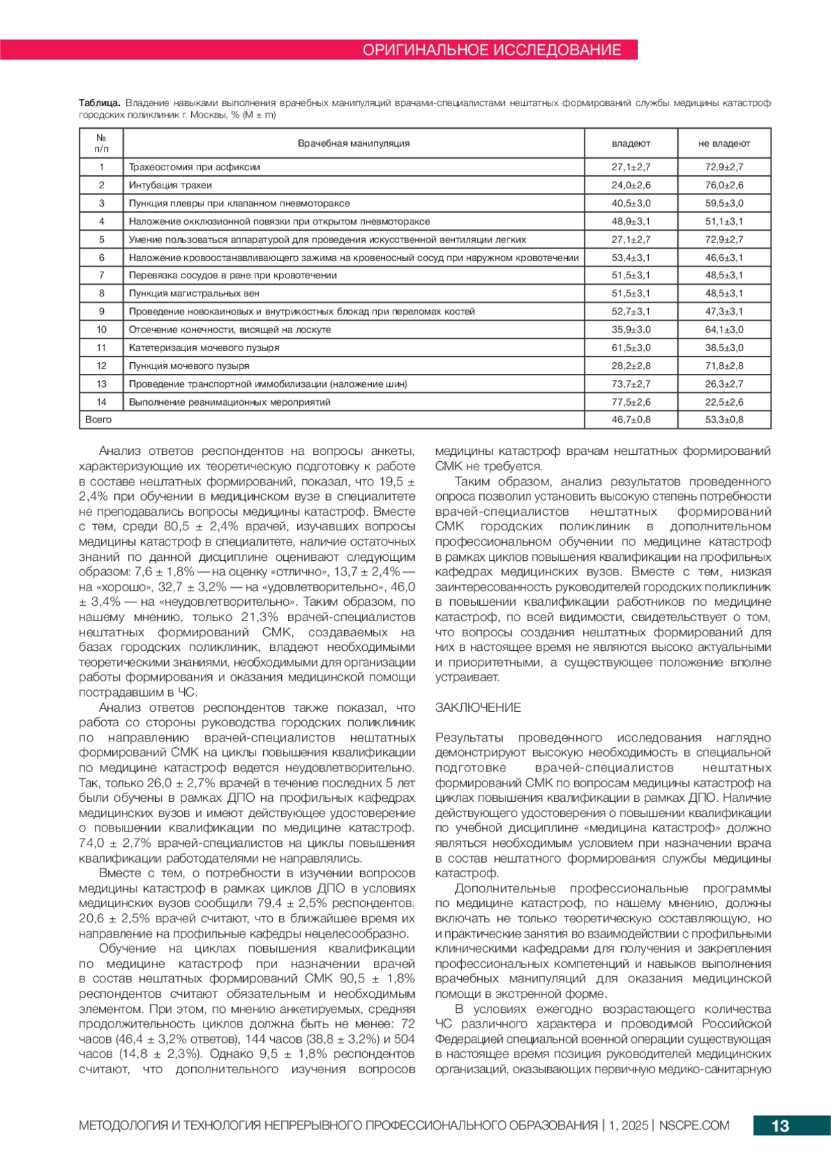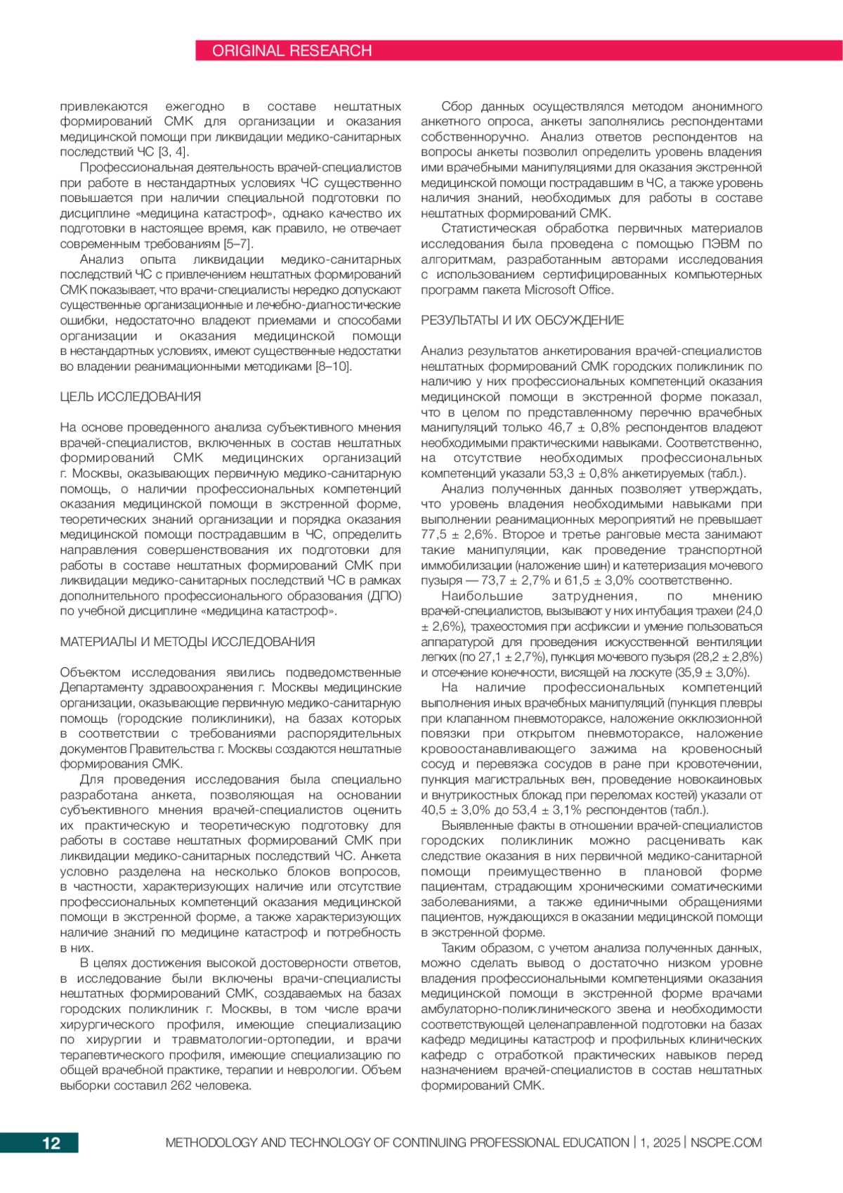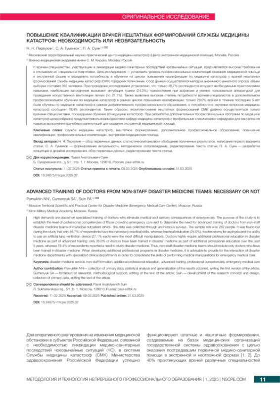 Статья: ПОВЫШЕНИЕ КВАЛИФИКАЦИИ ВРАЧЕЙ НЕШТАТНЫХ ФОРМИРОВАНИЙ СЛУЖБЫ МЕДИЦИНЫ КАТАСТРОФ: НЕОБХОДИМОСТЬ ИЛИ НЕОБЯЗАТЕЛЬНОСТЬ (2025)