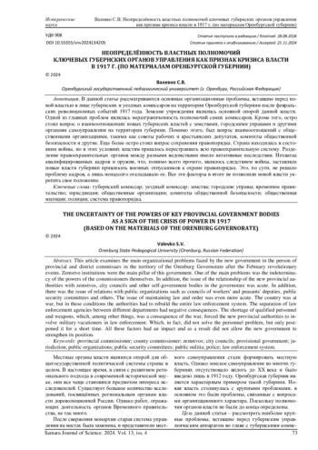 В данной статье рассматриваются основные организационные проблемы, вставшие перед новой властью в лице губернских и уездных комиссаров на территории Оренбургской губернии после февральских революционных событий 1917 года. Земские учреждения являлись основной опорой данной власти. Одной из главных проблем являлась неразграниченность полномочий самих комиссаров. Кроме того, остро стоял вопрос о взаимоотношениях новых губернских властей с земствами, городскими управами и другими органами самоуправления на территории губернии. Помимо этого, был вопрос взаимоотношений с общественными организациями, такими как советы рабочих и крестьянских депутатов, комитеты общественной безопасности и другие. Еще более остро стоял вопрос сохранения правопорядка. Страна находилась в состоянии войны, но в этих условиях властям пришлось перестраивать всю правоохранительную систему. Разделение правоохранительных органов между разными ведомствами имело негативные последствия. Нехватка квалифицированных кадров и оружия, что, помимо всего прочего, являлось следствием войны, заставляла новые власти губернии привлекать военных отпускников к охране правопорядка. Это, по сути, не решало проблему кадров, а лишь ненадолго откладывало ее. Все эти факторы в итоге не позволили новой власти укрепить свое положение.