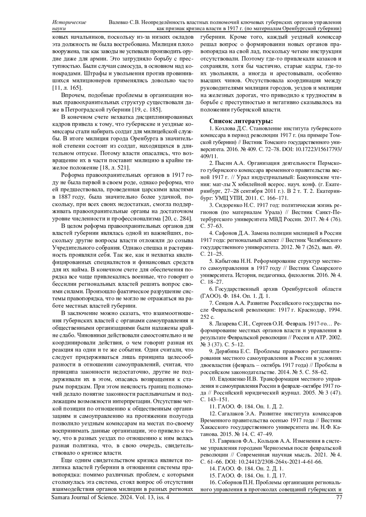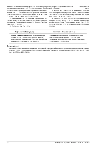 5. Кабытова Н.Н. Реформирование структур местного самоуправления в 1917 году // Вестник Самарского университета. История, педагогика, филология. 2016. № 4. С. 18-27. EDN: YKSIDB