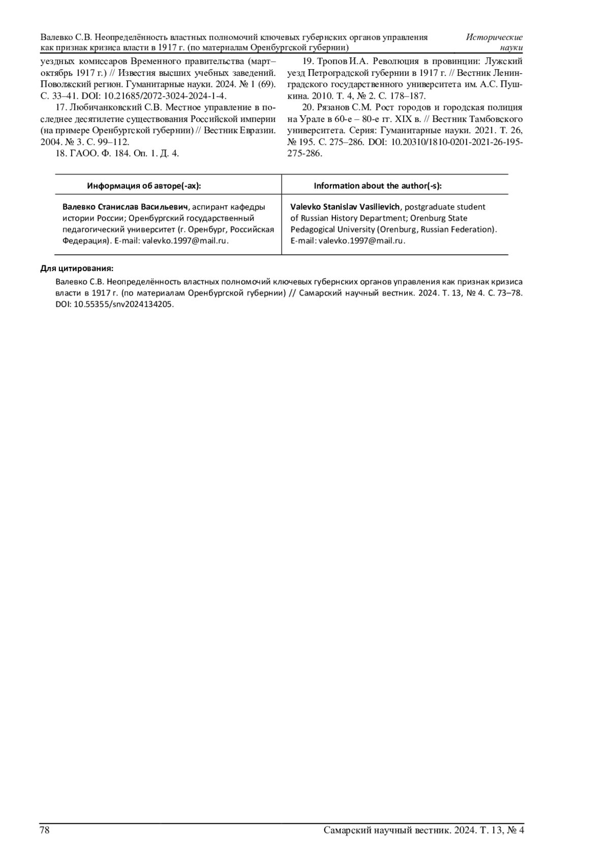 19. Тропов И.А. Революция в провинции: Лужский уезд Петроградской губернии в 1917 г. // Вестник Ленинградского государственного университета им. А.С. Пушкина. 2010. Т. 4, № 2. С. 178-187. EDN: RLYBTH 20. Рязанов С.М. Рост городов и городская полиция на Урале в 60-е - 80-е гг. XIX в. // Вестник Тамбовского университета. Серия: Гуманитарные науки. 2021. Т. 26, № 195. С. 275-286. DOI: 10.20310/1810-0201-2021-26-195-275-286 EDN: GKDQEJ