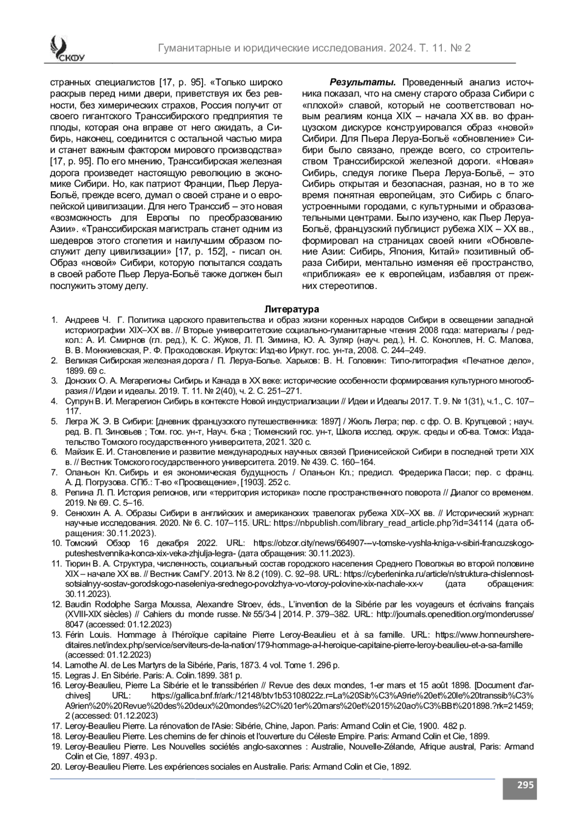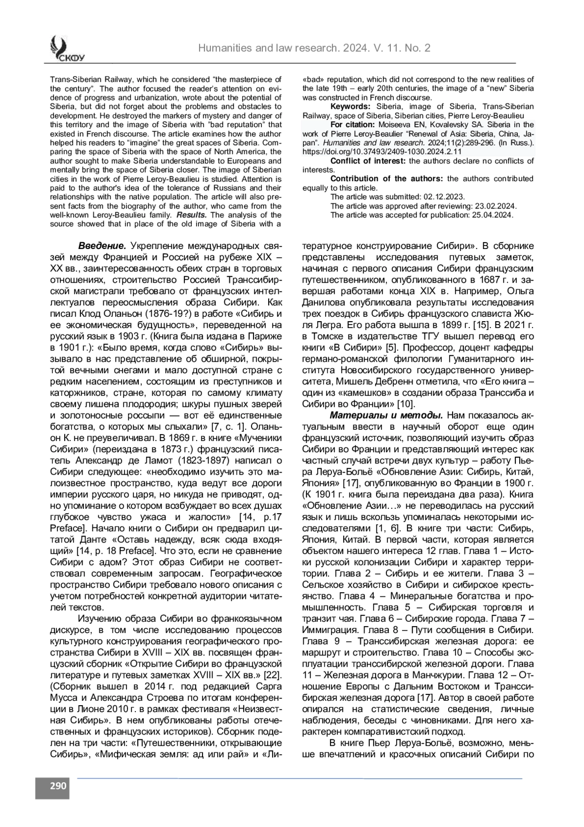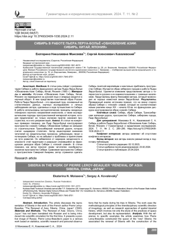МОИСЕЕВА Е. Н., КОВАЛЕВСКИЙ С. А. СИБИРЬ В РАБОТЕ ПЬЕРА ЛЕРУА-БОЛЬЁ «ОБНОВЛЕНИЕ АЗИИ: СИБИРЬ, КИТАЙ, ЯПОНИЯ» // ГУМАНИТАРНЫЕ И ЮРИДИЧЕСКИЕ ИССЛЕДОВАНИЯ. 2024. ТОМ 11, № 2