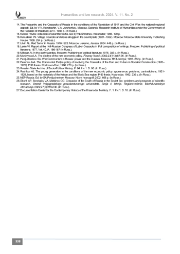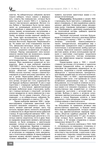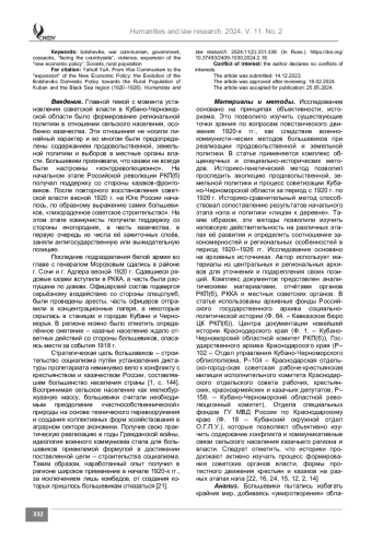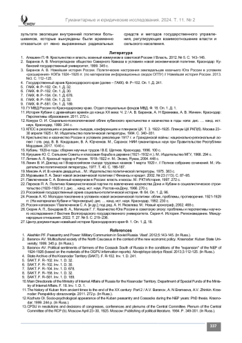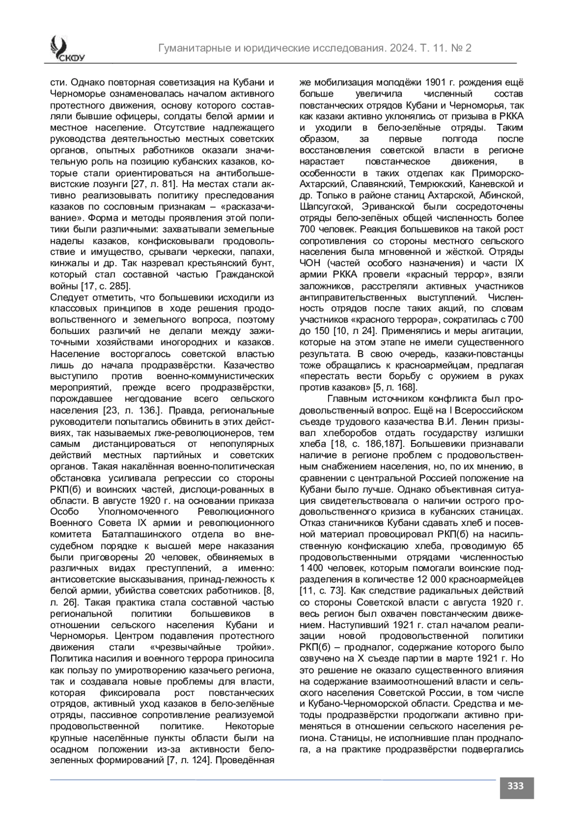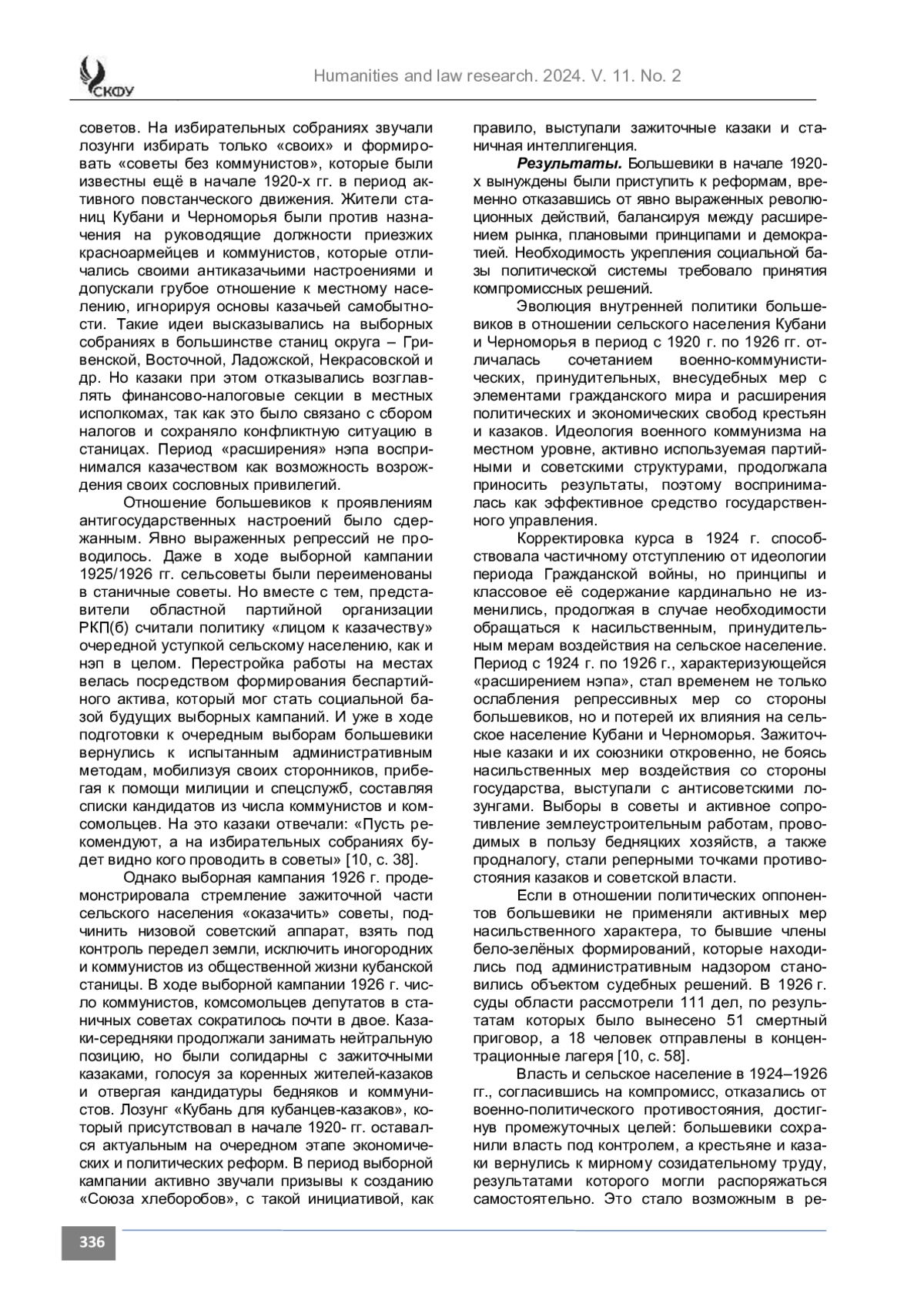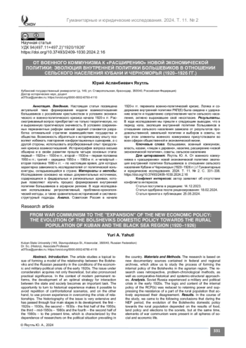 ЯХУТЛЬ Ю. А. ОТ ВОЕННОГО КОММУНИЗМА К «РАСШИРЕНИЮ» НОВОЙ ЭКОНОМИЧЕСКОЙ ПОЛИТИКИ: ЭВОЛЮЦИЯ ВНУТРЕННЕЙ ПОЛИТИКИ БОЛЬШЕВИКОВ В ОТНОШЕНИИ СЕЛЬСКОГО НАСЕЛЕНИЯ КУБАНИ И ЧЕРНОМОРЬЯ (1920–1926 ГГ.) // ГУМАНИТАРНЫЕ И ЮРИДИЧЕСКИЕ ИССЛЕДОВАНИЯ. 2024. ТОМ 11, № 2