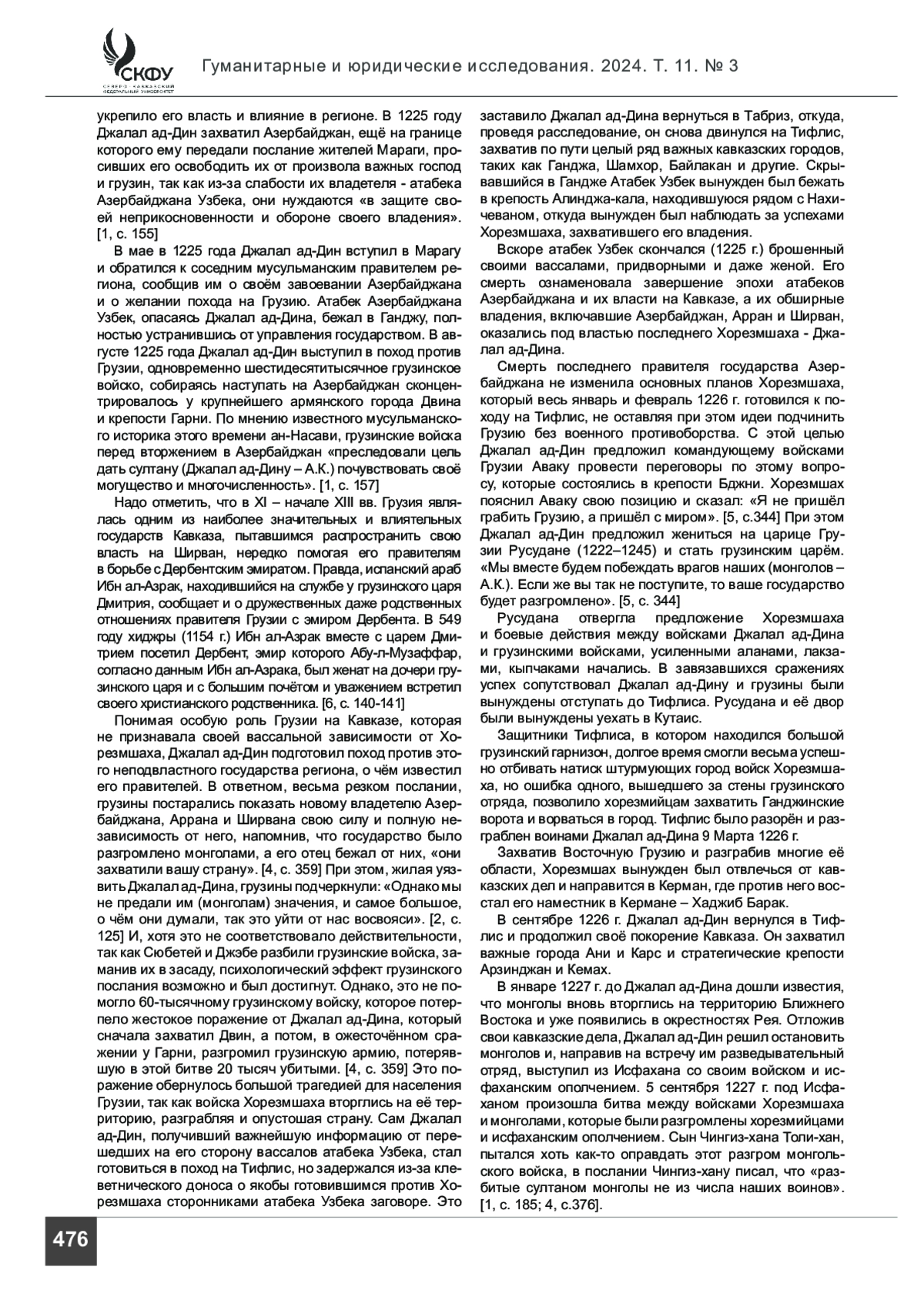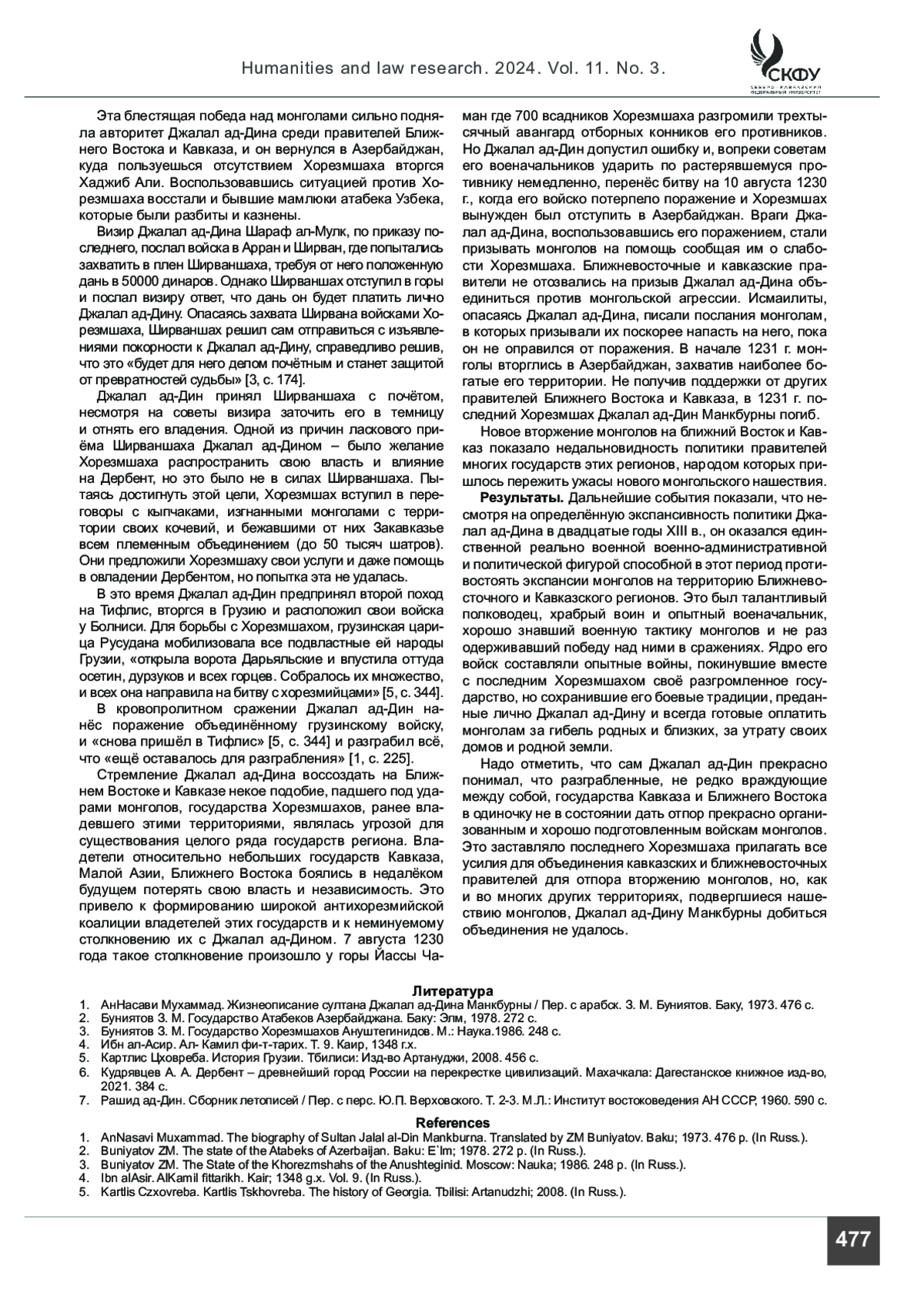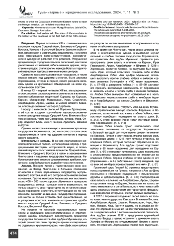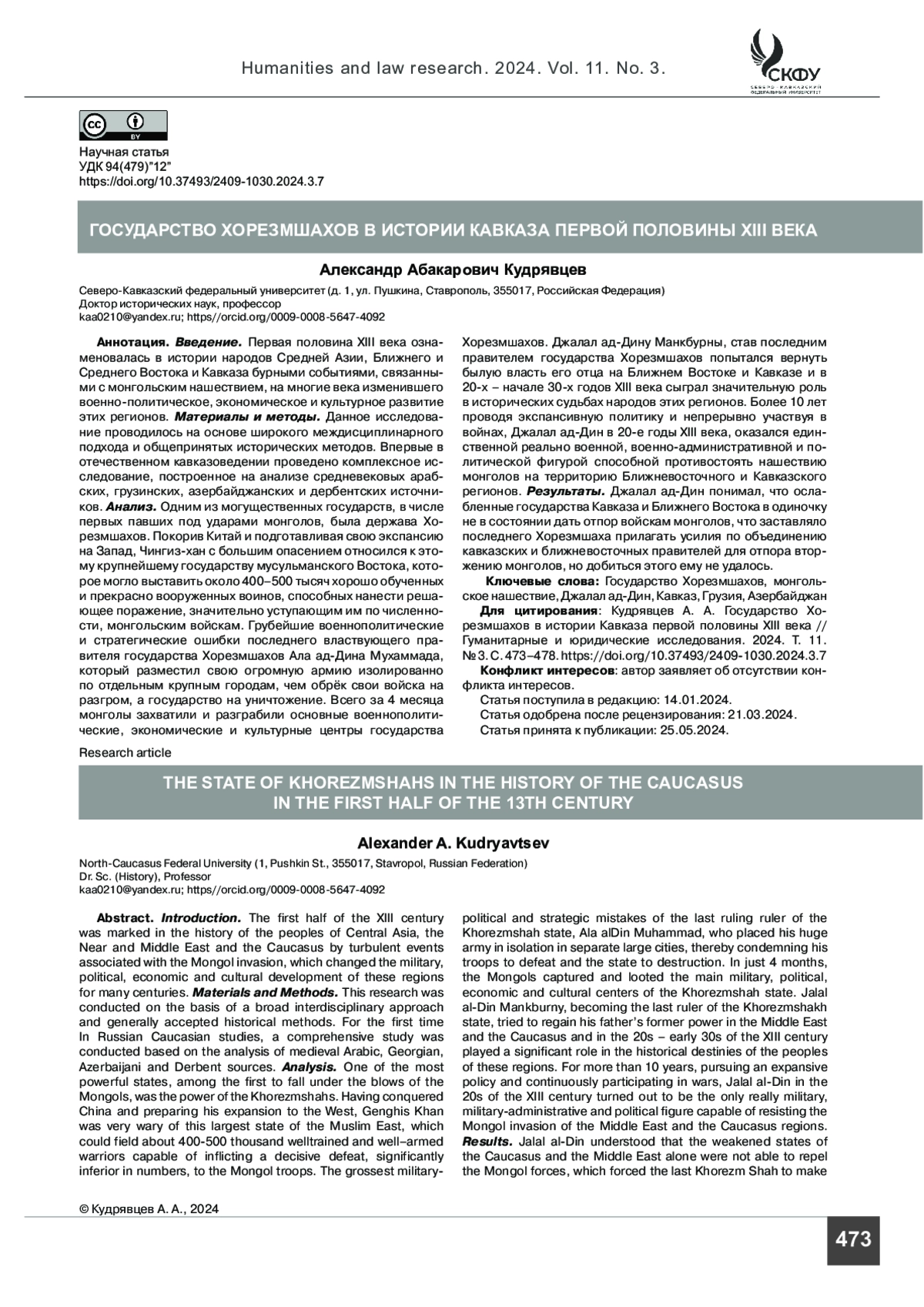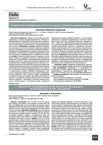 КУДРЯВЦЕВ А. А. ГОСУДАРСТВО ХОРЕЗМШАХОВ В ИСТОРИИ КАВКАЗА ПЕРВОЙ ПОЛОВИНЫ XIII ВЕКА // ГУМАНИТАРНЫЕ И ЮРИДИЧЕСКИЕ ИССЛЕДОВАНИЯ. 2024. ТОМ 11, № 3