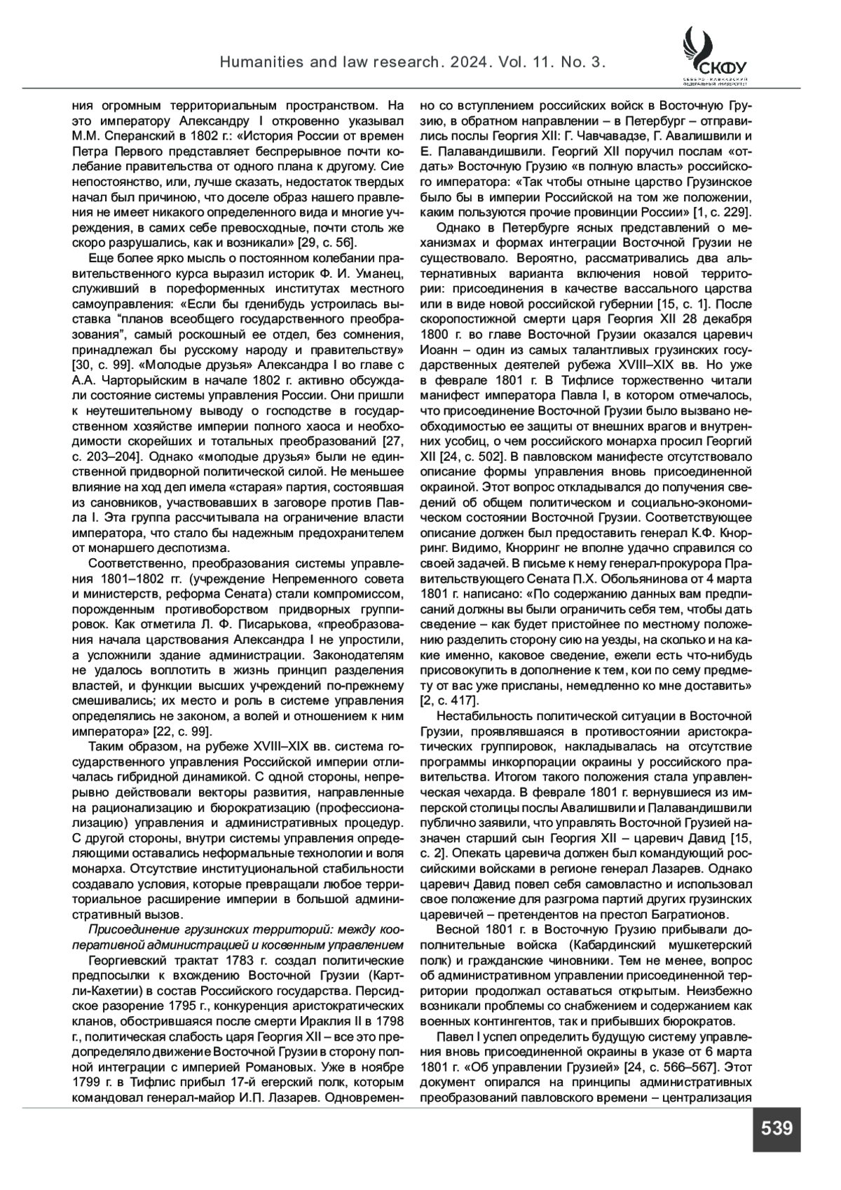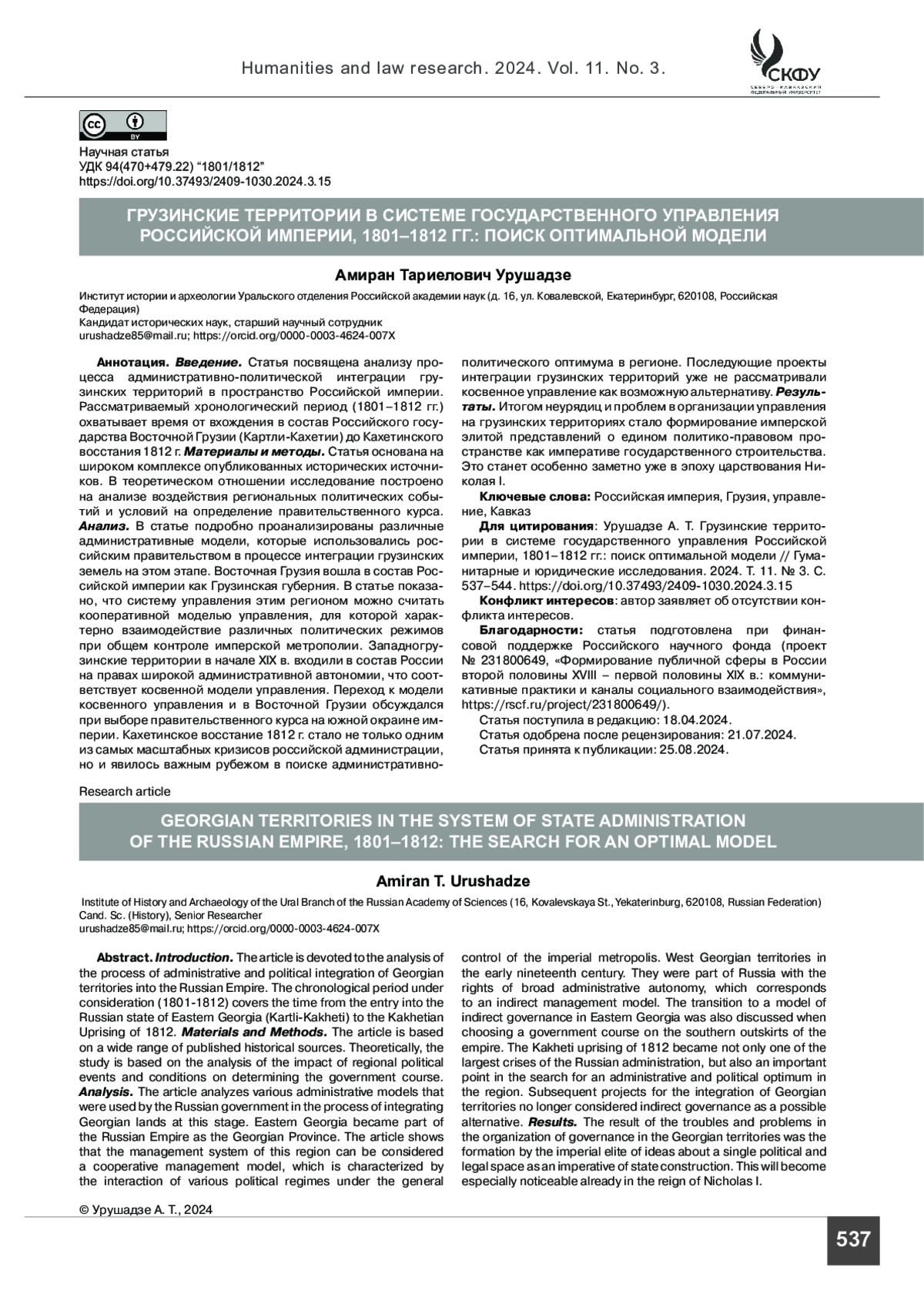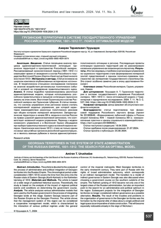 Введение. Статья посвящена анализу процесса административно-политической интеграции грузинских территорий в пространство Российской империи. Рассматриваемый хронологический период (1801–1812 гг.) охватывает время от вхождения в состав Российского государства Восточной Грузии (Картли-Кахетии) до Кахетинского восстания 1812 г.