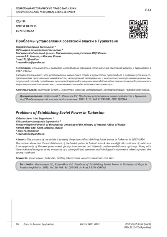 ГОРБАЧЕВА И. Е., РАЗМАХОВ К. Е. ПРОБЛЕМЫ УСТАНОВЛЕНИЯ СОВЕТСКОЙ ВЛАСТИ В ТУРКЕСТАНЕ // ПРОБЕЛЫ В РОССИЙСКОМ ЗАКОНОДАТЕЛЬСТВЕ. 2023. Т. 16 № 8 (36 СТ.)