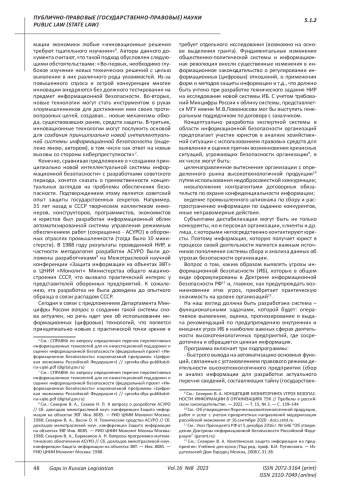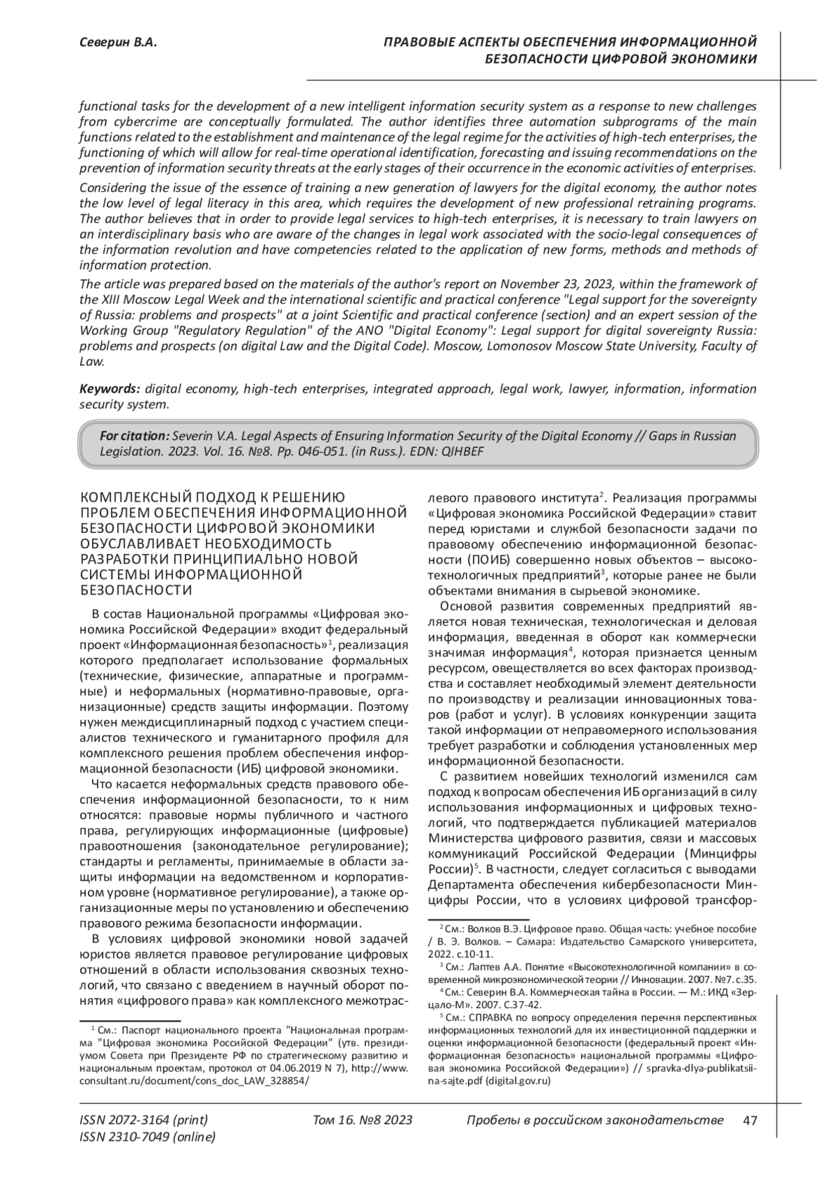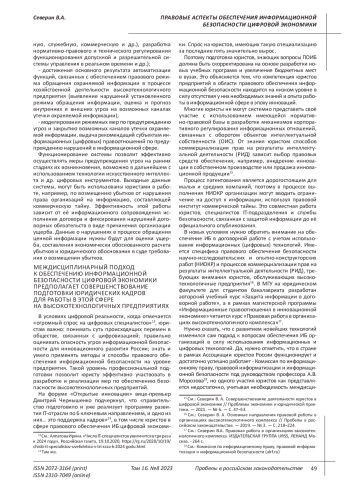 В статье подчеркивается, что обеспечение информационной безопасности цифровой экономики возможно только на основе комплексного подхода на междисциплинарной основе, что связано с необходимостью улучшения профессионального взаимодействия специалистов и подготовки юридических кадров для этой сферы. С учетом предложения Департамента обеспечения кибербезопасности Минцифры России концептуально сформулированы функциональные задачи по разработке новой интеллектуальной системы информационной безопасности как ответ на новые вызовы со стороны киберпреступности. Автор выделяет три подпрограммы автоматизации основных функций, связанных с установлением и обеспечением правового режима деятельности высокотехнологичных предприятий, функционирование которых позволит в реальном времени осуществлять оперативное выявление, прогнозирование и выдачу рекомендаций по предупреждению угроз ИБ на ранних стадиях их возникновения в хозяйственной деятельности предприятий. Рассматривая вопрос о сущности подготовки юристов нового поколения для цифровой экономики, автор отмечает низкий уровень юридической грамотности в этой сфере, что требует разработки новых программ профессиональной переподготовки. Автор считает, что для правового обслуживания высокотехнологичных предприятий нужно готовить юристов на междисциплинарной основе, осознающих перемены в правовой работе, связанные с социально-правовыми последствиями информационной революции и имеющих компетенции, связанные с применением новых форм, методов и способов защиты информации. Статья подготовлена по материалам доклада автора 23 ноября 2023 г. в рамках XIII Московской юридической недели и международной научно-практической конференции «Правовое обеспечение суверенитета России: проблемы и перспективы» на совместной Научно-практической конференции (секции) и экспертной сессии Рабочей группы «Нормативное регулирование» АНО «Цифровая экономика»: Правовое обеспечение цифрового суверенитета России: проблемы и перспективы (о цифровом праве и Цифровом кодексе). Москва, МГУ имени М. В. Ломоносова, Юридический факультет.