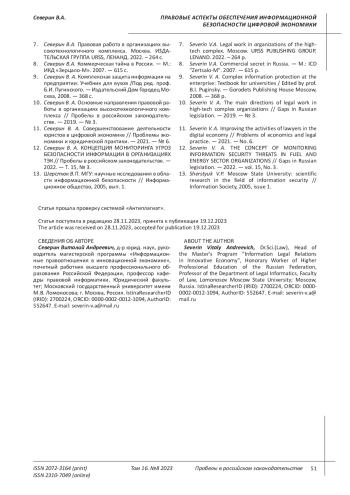 7. Северин В.А. Правовая работа в организациях высокотехнологичного комплекса. Москва. ИЗДАТЕЛЬСКАЯ ГРУППА URSS, ЛЕНАНД. 2022. - 264 с. EDN: NBZCSO