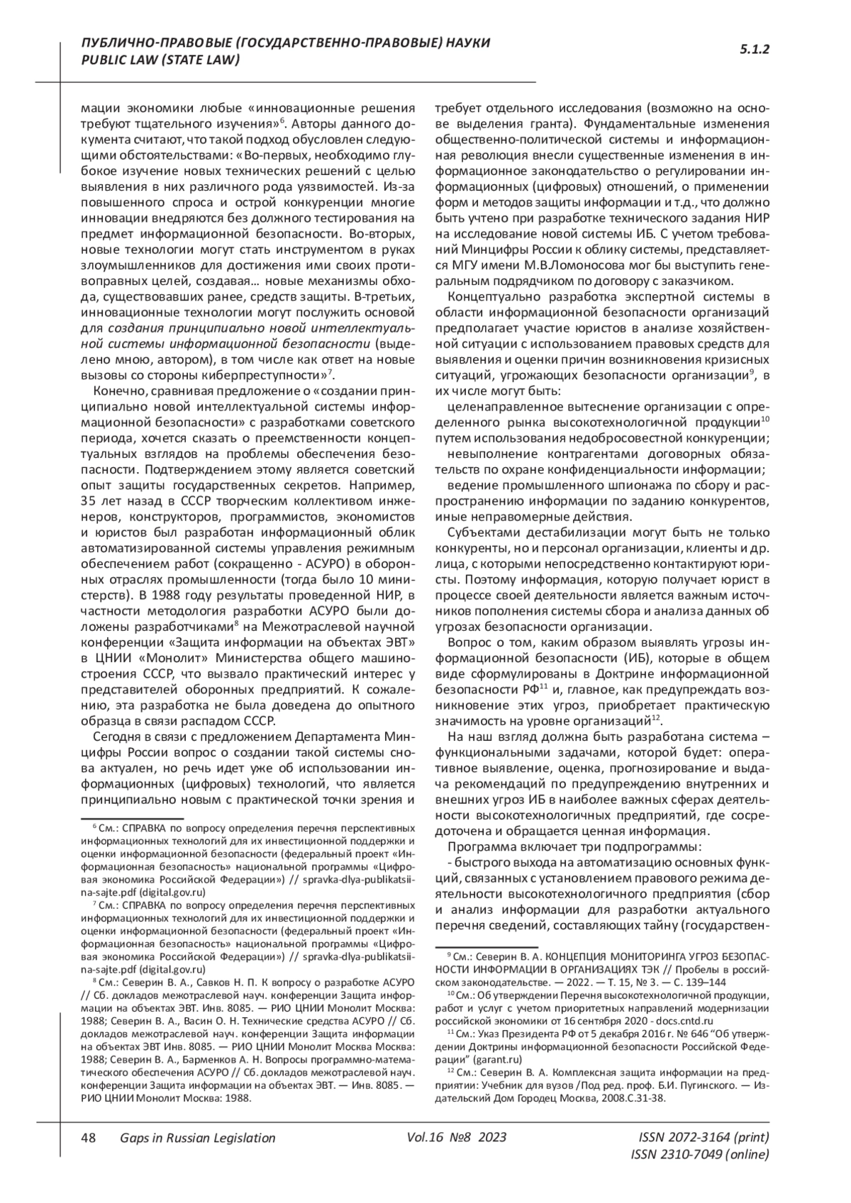 12. Северин В. А. КОНЦЕПЦИЯ МОНИТОРИНГА УГРОЗ БЕЗОПАСНОСТИ ИНФОРМАЦИИ В ОРГАНИЗАЦИЯХ ТЭК // Пробелы в российском законодательстве. - 2022. - Т. 15, № 3. EDN: EWLHQE