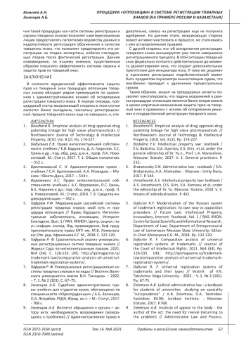 Статья посвящена исследованию института возражений на регистрацию товарных знаков, известному как «процедура оппозиции товарных знаков». Данная процедура является одним из механизмов защиты товарного знака в досудебном (административном) порядке. В статье рассматриваются вопросы юридической природы и роль процедуры оппозиции товарных знаков в системе защиты интеллектуальных прав. Исследуются проблемы и особенности становления процедуры подачи и рассмотрения возражений против регистрации товарных знаков в законодательстве России и Казахстана, делается вывод об определенных преимуществах данной процедуры по сравнению с судебной. Процедура заявления возражений позволяет обеспечить защиту интеллектуальных прав, предотвращая незаконную регистрацию товарных знаков еще на этапе рассмотрения заявки. Она является экономически более эффективным способом разрешения конфликтов, поскольку позволяет избежать долгого и затратного судебного процесса.