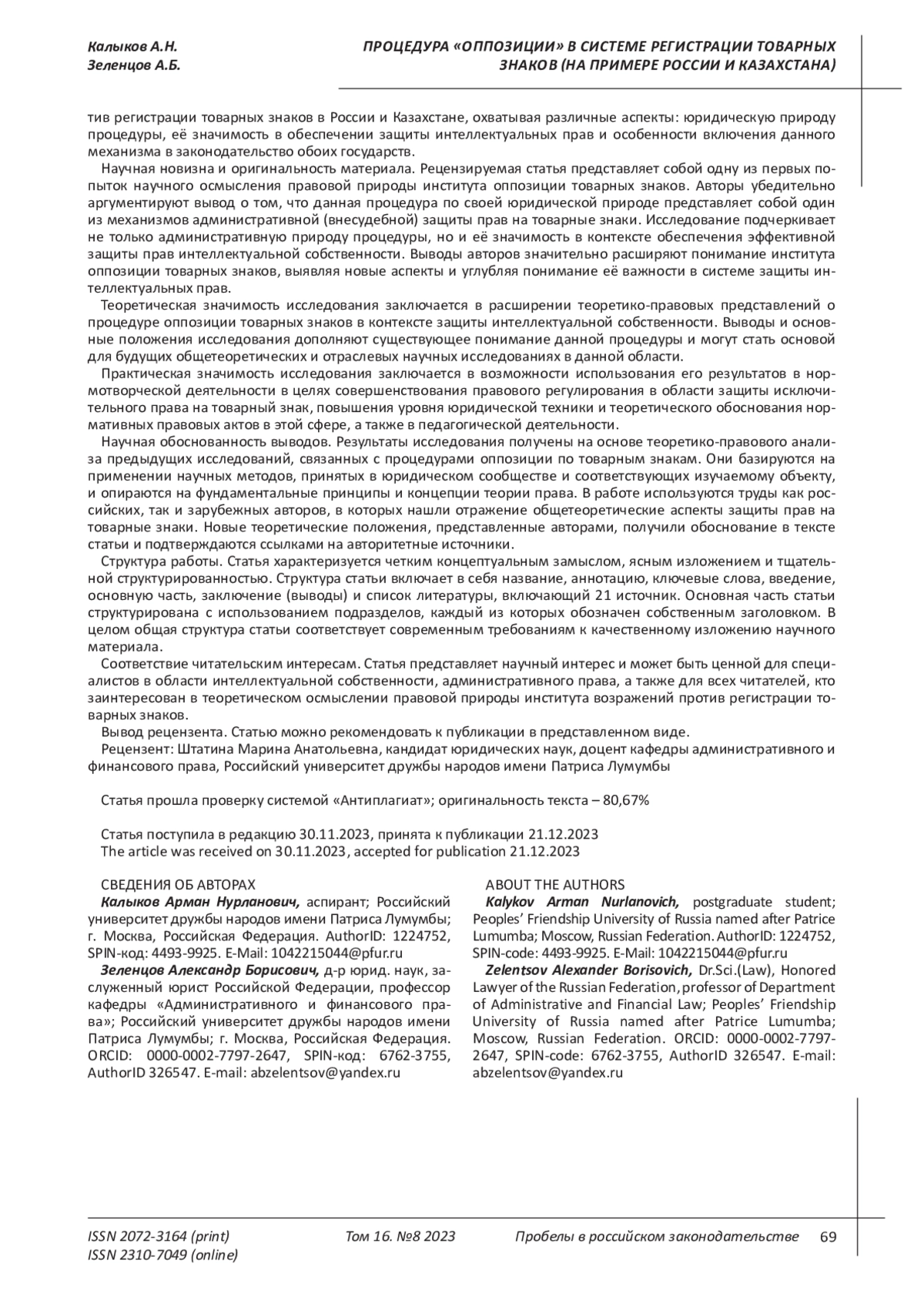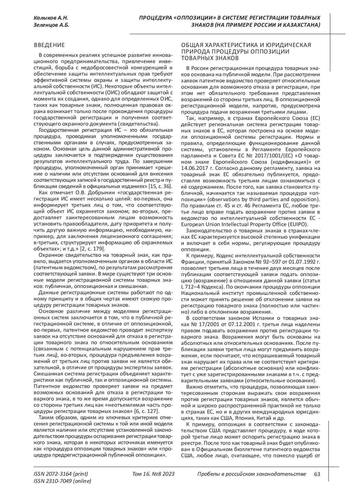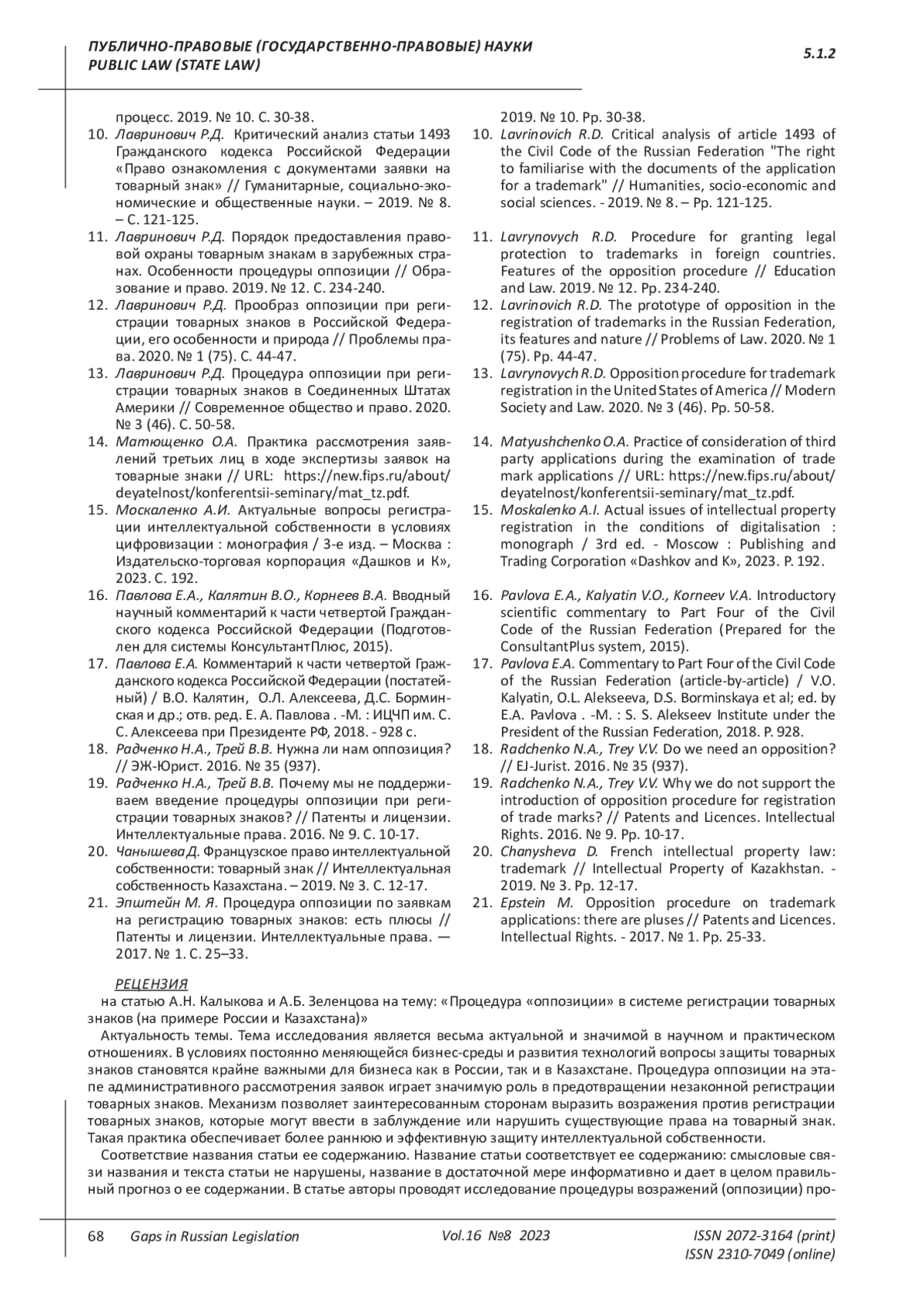 12. Лавринович Р.Д. Прообраз оппозиции при регистрации товарных знаков в Российской Федерации, его особенности и природа // Проблемы права. 2020. № 1 (75). С. 44-47. EDN: KVQRXJ