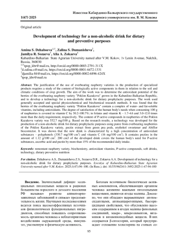 Обоснование использования ремонтантных сортов малины в производстве продуктов специализированного назначения требует исследования содержания в них биологически активных компонентов применительно к почвенно-климатическим условиям произрастания культуры. Целью работы являлось определение антиоксидантного потенциала ягод ремонтантной малины сорта «Поклон Казакову», выращенной в Кабардино-Балкарской Республике, и разработка технологии безалкогольного напитка диетического профилактического назначения. В работе использовались общепринятые и специальные физико-химические и биохимические методы исследования. Установлено, что ягоды ремонтантной малины сорта «Поклон Казакову» содержат комплекс водо и жирорастворимых витаминов, в том числе антиоксидантов. Степень удовлетворения потребности организма человека при потреблении 100 г ягод малины покрывается в витамине С на 30,2-100,7%; в фолатах и в витамине К - в 1,7-4,6 и 3,0-12,0 раза больше суточной нормы соответственно. Содержание Р-активных соединений в ягодах малины сорта «Поклон Казакову» составило 552,7 мг/100 г. На основании результатов исследования разработана технология производства безалкогольного напитка диетического профилактического назначения с использованием пюре из ремонтантной малины сорта «Поклон Казакову», пектинового экстракта из створок зеленого горошка, сахарозаменителя эритрита и биокорректора «Абифлор». Показано, что новый напиток характеризуется высокой концентрацией веществ антиоксидантного ряда - полифенолов (330,7 мг/100 см3) и витамина С (16 мг/100 см3). В нем обнаружены пектины в количестве 1,12 г/100 см3. 200 см3 разработанного напитка покрывает потребность организма человека в Р-активных веществах, аскорбиновой кислоте и пектине более чем на 15% от рекомендуемого суточного потребления.