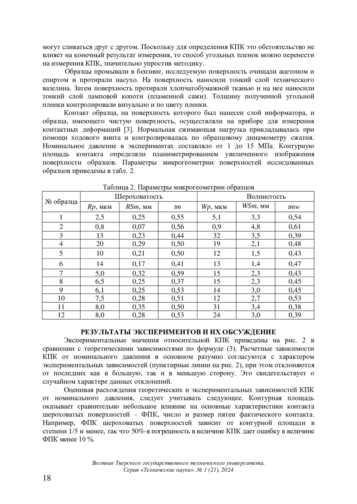 Исследовано влияние волнистости технических поверхностей на контактное взаимодействие деталей машин. Приведены параметры шероховатости и волнистости поверхностей экспериментальных образцов по ГОСТ Р ИСО 4287-2014, механические свойства материалов образцов, дано описание методики эксперимента. Предложены теоретические зависимости контурной площади контакта от номинального давления, параметров шероховатости и волнистости контактирующих поверхностей и механических свойств материалов контактирующих деталей. Теоретически и экспериментально показано, что волнистость существенно влияет на величину площади контакта деталей машин. Отмечено, что в зависимости от величины номинального контактного давления контурная площадь, образовавшаяся в результате упругой деформации волн, составляет от нескольких единиц до нескольких десятков процентов от номинальной площади контакта