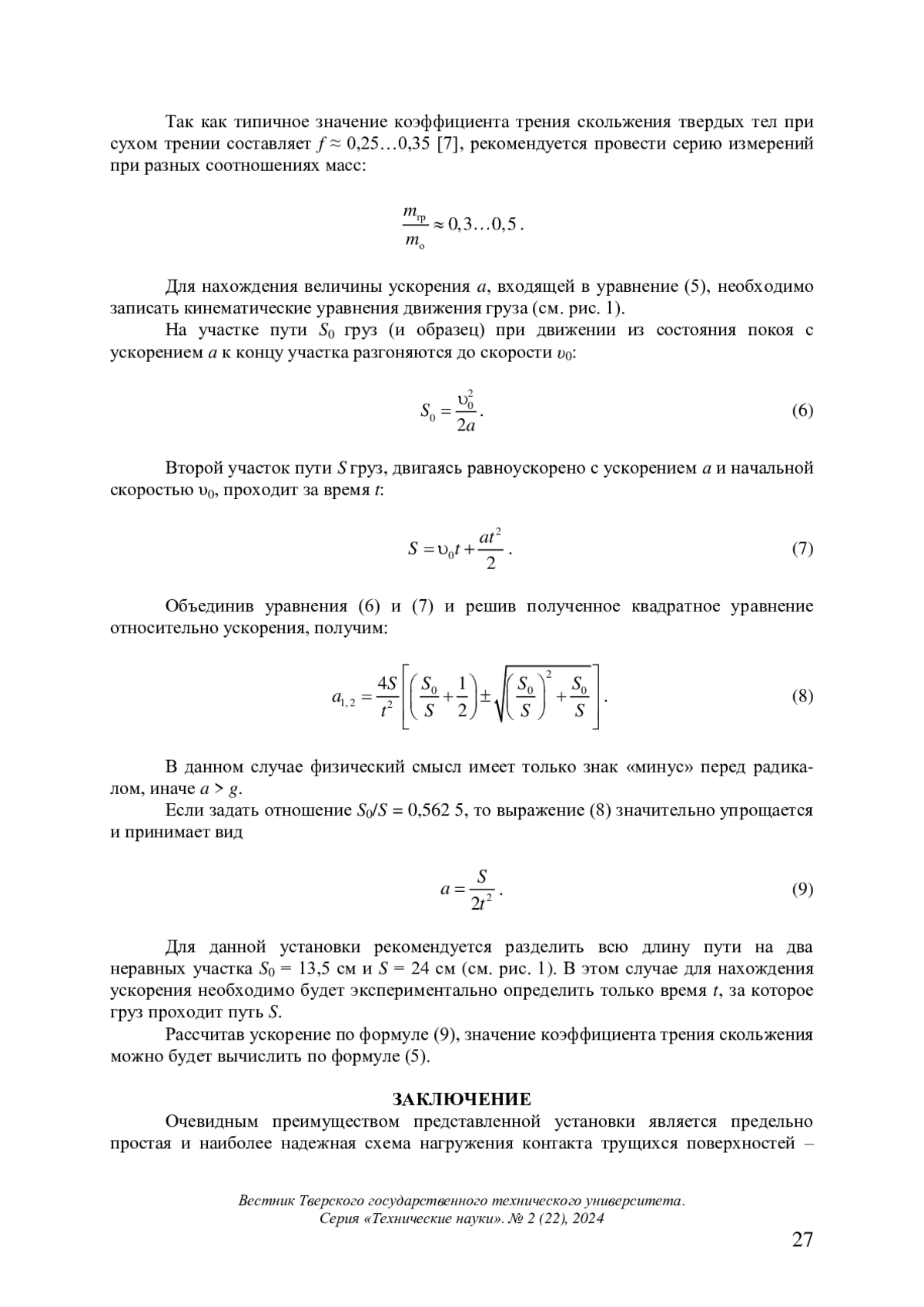Представлена схема и дано описание конструкции лабораторной установки для экспериментального определения коэффициента трения скольжения, собранной на основе классической машины Атвуда. Описана методика проведения измерений. Предложены формулы, позволяющие рассчитать коэффициент трения. Преимуществом представленной установки является предельно простая и самая надежная схема нагружения контакта трущихся поверхностей – гравитационная, которая обеспечивает стабильные и абсолютно точные значения как силы нормального давления на контакт, так и тангенциальной силы. Относительная приборная погрешность не превышает 0,5 %, что значительно меньше случайной погрешности, характерной для экспериментов по измерению коэффициентов трения. Рекомендуется использовать модернизированную установку и методику для создания лабораторной работы в курсах трибологии и триботехники