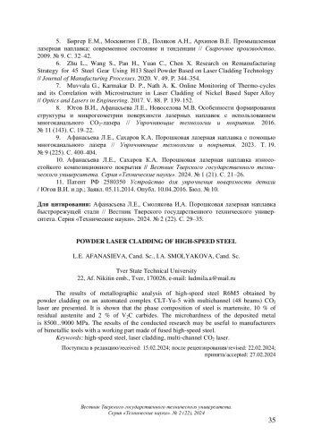 10. Афанасьева Л.Е., Сахаров К.А. Порошковая лазерная наплавка износостойкого композиционного покрытия // Вестник Тверского государственного технического университета. Серия “Технические науки”. 2024. № 1 (21). С. 21-26. EDN: GGKCBD
