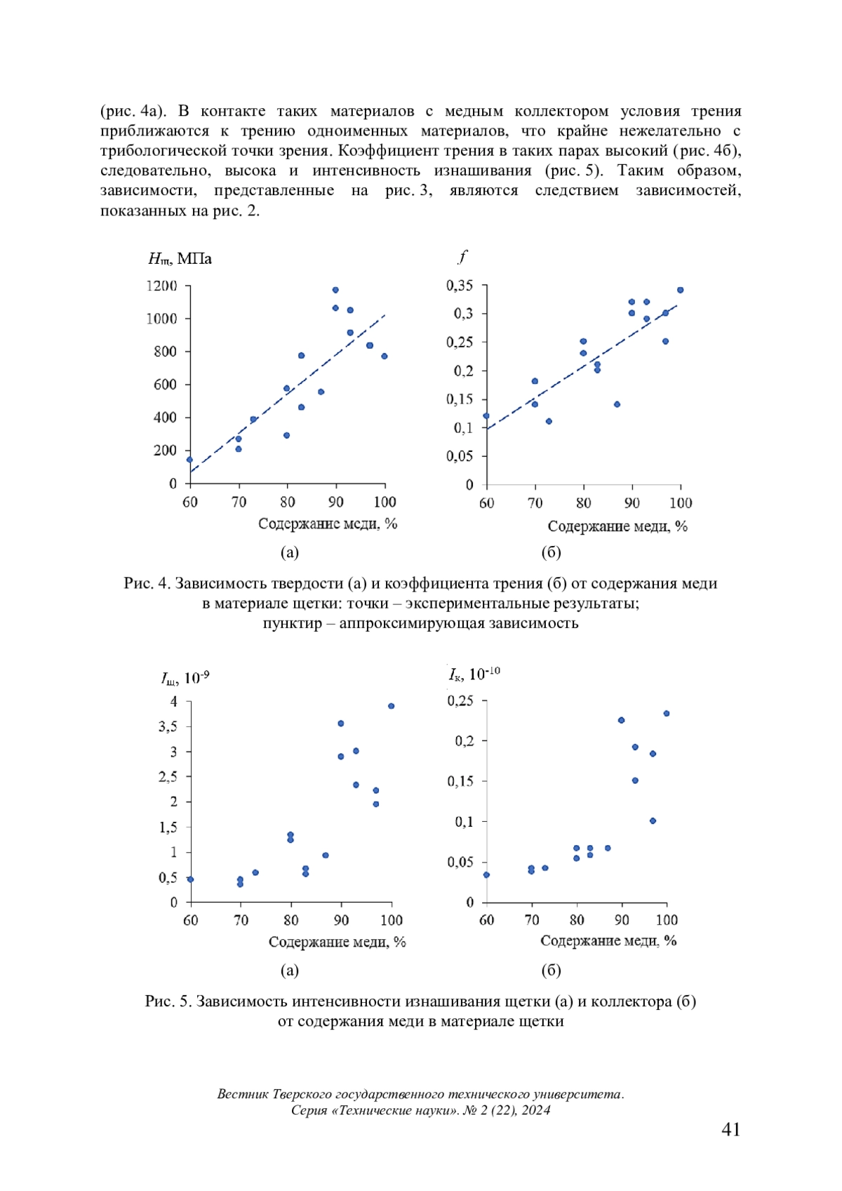 Рассмотрены корреляционные соотношения, описывающие зависимость линейной интенсивности изнашивания фрикционного контакта от коэффициента трения и твердости материалов компонентов пары трения. Соотношения получены статистической обработкой экспериментальных данных, относящихся к паре трения «щетка – коллектор». Установлена сильная корреляционная связь линейной интенсивности изнашивания компонентов пары трения с коэффициентом трения, а также обнаружена сильная положительная корреляция линейной интенсивности изнашивания с твердостью материалов щетки и коллектора, что противоречит известным результатам, свидетельствующим о возрастании износостойкости с увеличением твердости трущихся деталей. Приводится наиболее вероятное объяснение такого противоречия. Кроме того, указанная зависимость носит немонотонный характер с заметным возрастанием скорости изнашивания, если твердость материала щетки становится сравнимой с твердостью материала коллектора