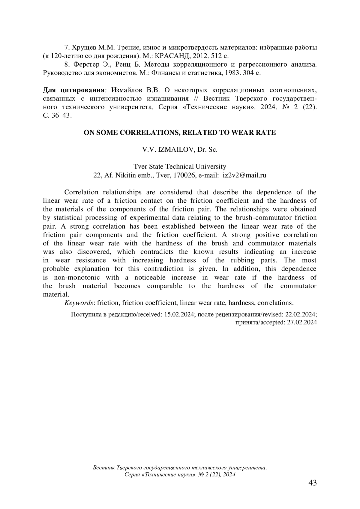 ИЗМАЙЛОВ В. В. О НЕКОТОРЫХ КОРРЕЛЯЦИОННЫХ СООТНОШЕНИЯХ, СВЯЗАННЫХ С ИНТЕНСИВНОСТЬЮ ИЗНАШИВАНИЯ // ВЕСТНИК ТВЕРСКОГО ГОСУДАРСТВЕННОГО ТЕХНИЧЕСКОГО УНИВЕРСИТЕТА. СЕРИЯ: ТЕХНИЧЕСКИЕ НАУКИ. 2024. № 2 (22)