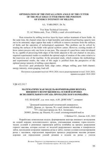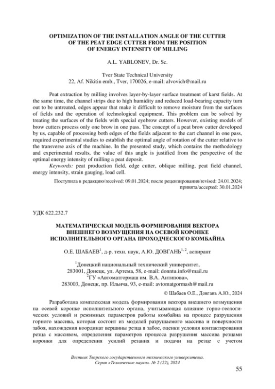 Статья: МАТЕМАТИЧЕСКАЯ МОДЕЛЬ ФОРМИРОВАНИЯ ВЕКТОРА ВНЕШНЕГО ВОЗМУЩЕНИЯ НА ОСЕВОЙ КОРОНКЕ ИСПОЛНИТЕЛЬНОГО ОРГАНА ПРОХОДЧЕСКОГО КОМБАЙНА (2024)