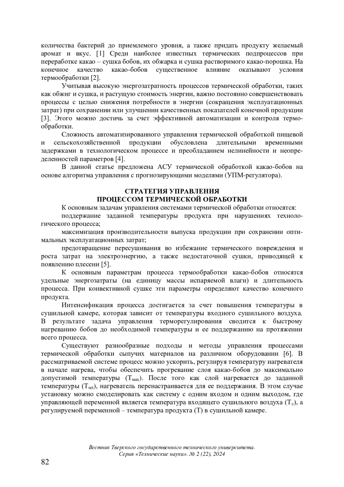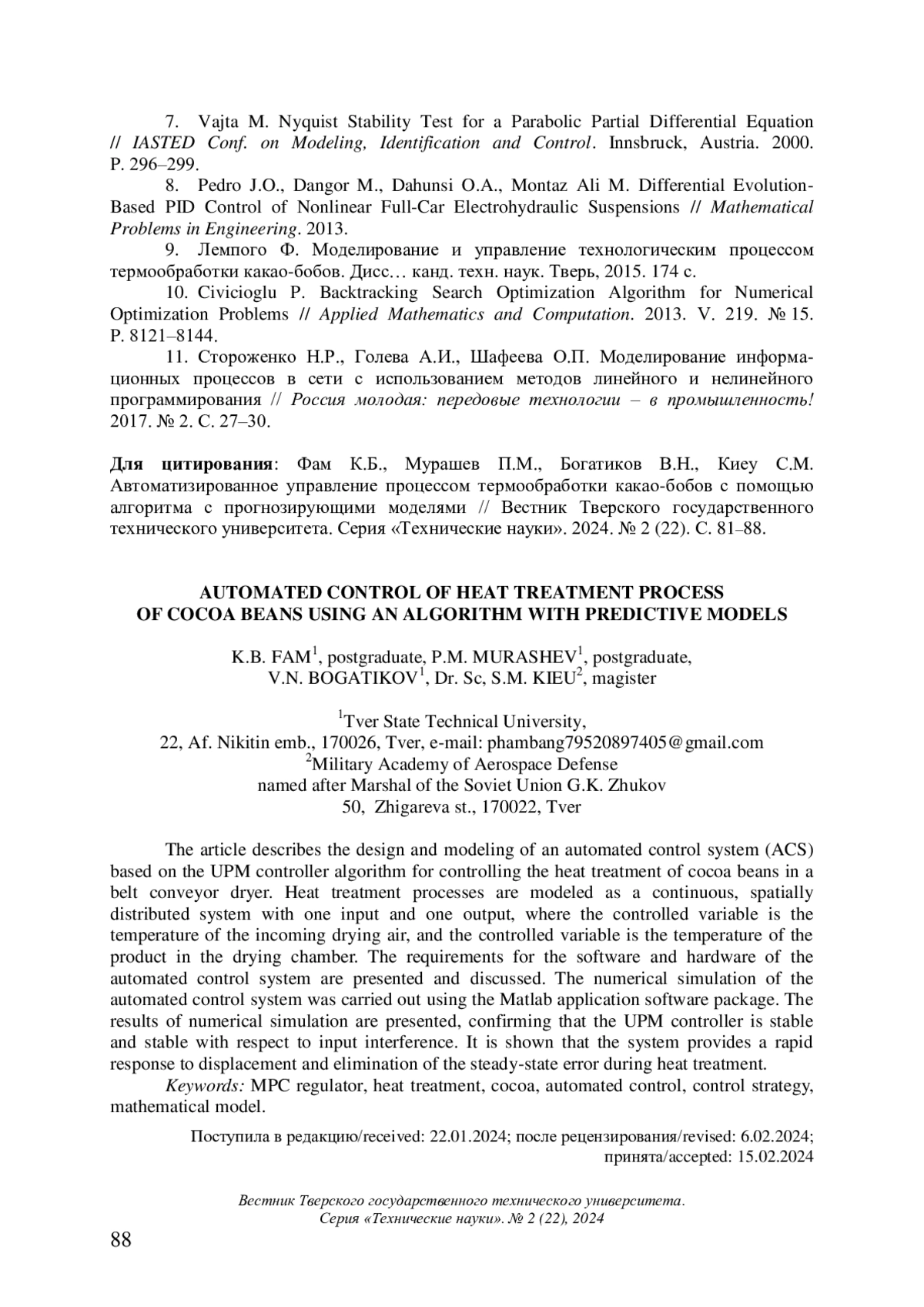 В статье описано проектирование и моделирование автоматизированной системы управления (АСУ) на основе алгоритма УПМ-регулятора для управления термической обработкой какао-бобов в ленточной конвейерной сушилке. Процессы термической обработки моделируются как непрерывная, пространственно распределенная система с одним входом и одним выходом, где регулируемой переменной является температура входящего сушильного воздуха, а контролируемой переменной ‒ температура продукта в сушильной камере. Представлены и обсуждены требования к программному и аппаратному обеспечению АСУ. Численное моделирование АСУ проводилось с использованием пакета прикладных программ Matlab. Приведены результаты численного моделирования, подтверждающие, что УПМ-регулятор стабилен и устойчив по отношению к входным помехам. Показано, что система обеспечивает быструю реакцию на смещение и устранение установившейся ошибки в процессе термической обработки
