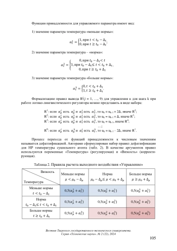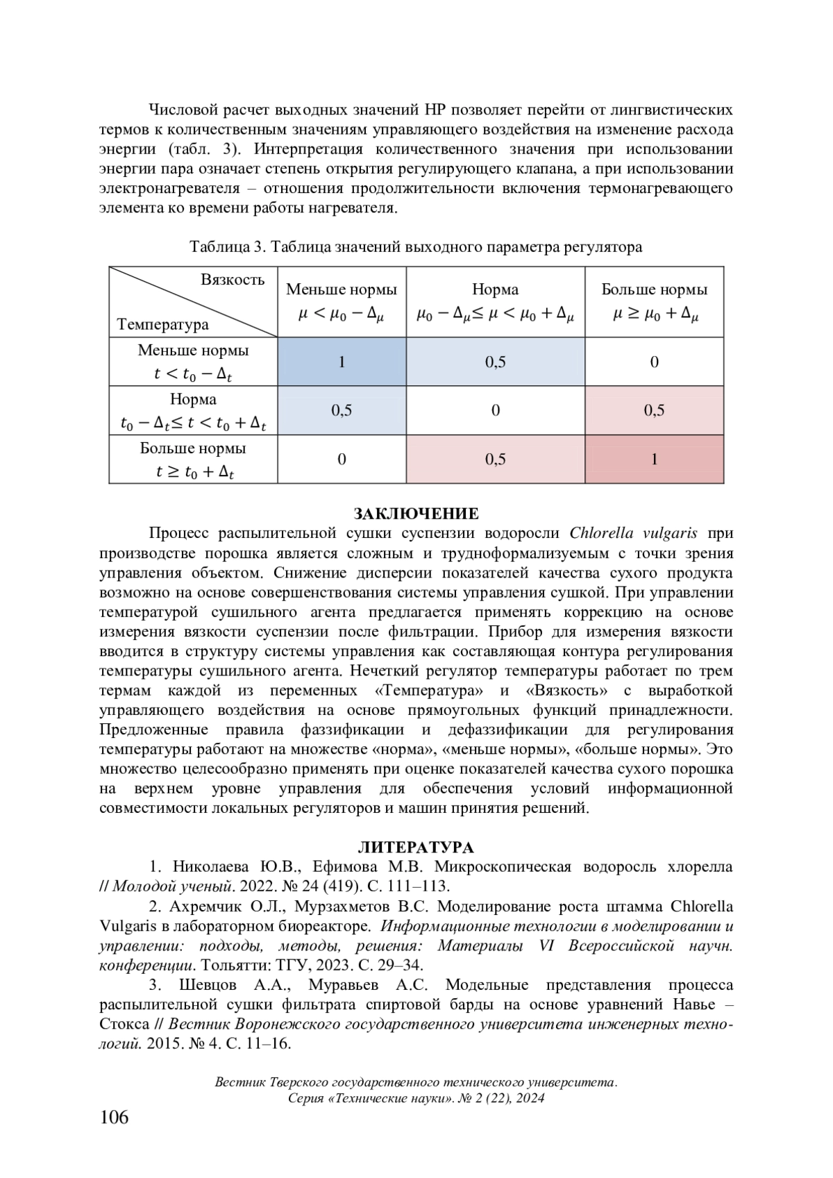 Представлены результаты, полученные в ходе процедур структурного синтеза систем управления сушкой суспензии микроводоросли. Снижение дисперсии показателей качества порошка хлореллы обеспечивается за счет использования корректирующего воздействия по вязкости суспензии в регуляторе температуры сушильного агента. Вязкость измеряется перед подачей суспензии на распылительное сопло дополнительно введенным в состав системы управления прибором. Рассмотрена структура измерителя вязкости суспензии. В качестве регулятора температуры предлагается применять нечеткий регулятор температуры сушильного агента. Лингвистическая оценка регулируемого и корректирующего воздействий осуществляяется по трем термам на основе прямоугольных функций принадлежности.