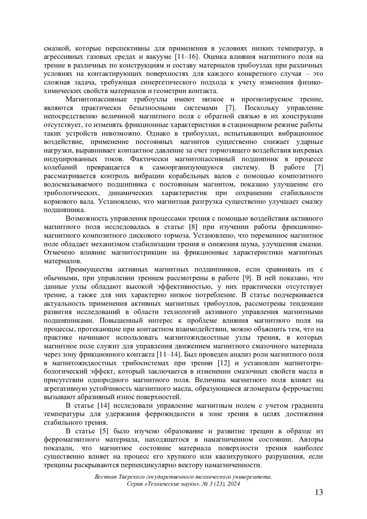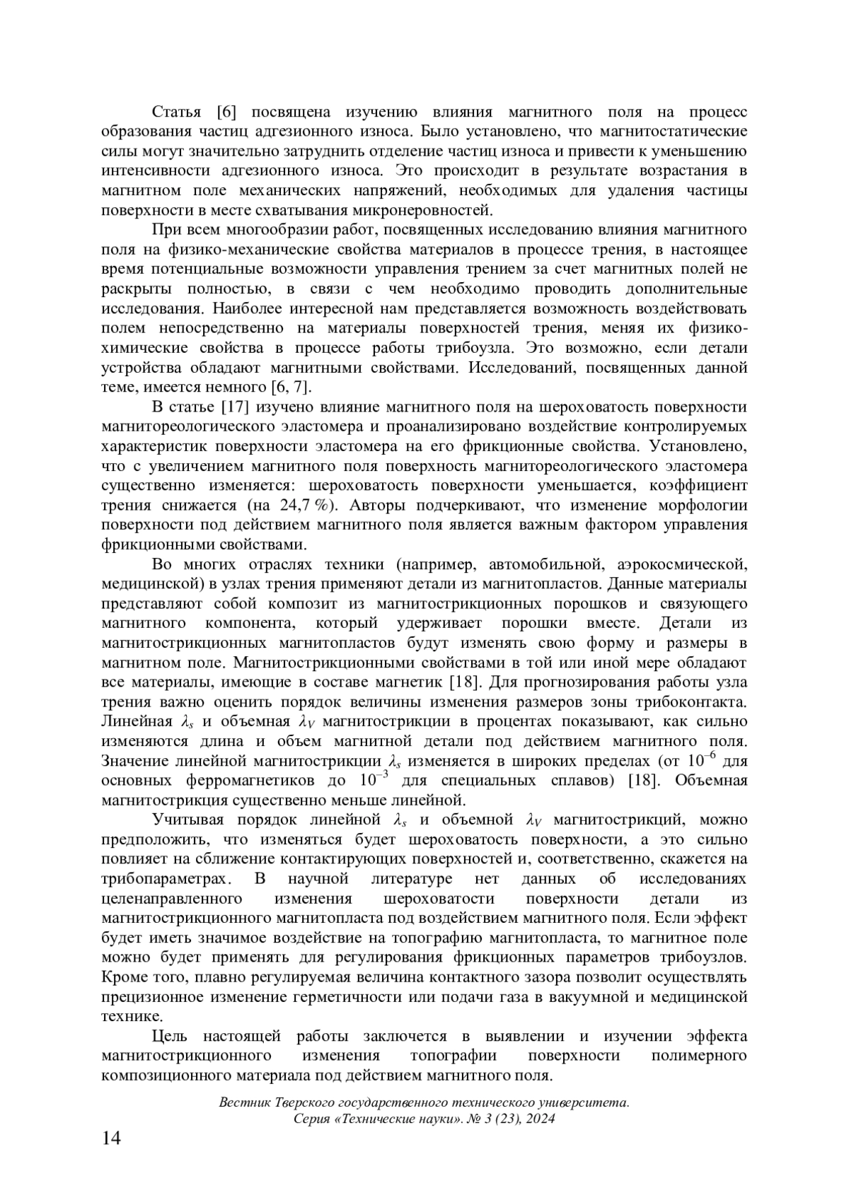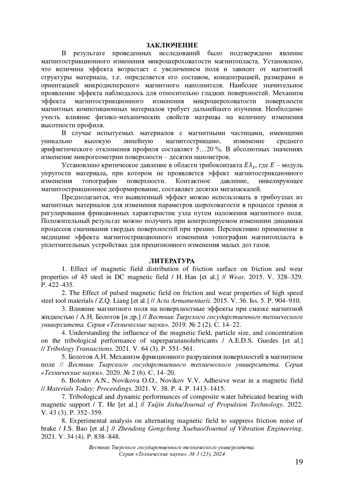 3. 	Влияние магнитного поля на поверхностные эффекты при смазке магнитной жидкостью / А.Н. Болотов [и др.] // Вестник Тверского государственного технического университета. Серия “Технические науки”. 2019. № 2 (2). С. 14-22.  EDN: NFYJKB