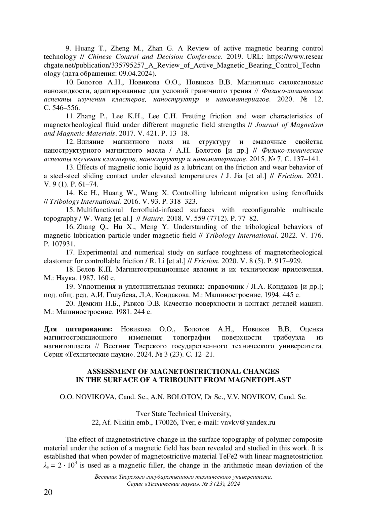 6. 	Bolotov A.N., Novikova O.O., Novikov V.V. Adhesive wear in a magnetic field // Materials Today: Proceedings. 2021. V. 38. P. 4. P. 1413-1415.  EDN: QPBSLL