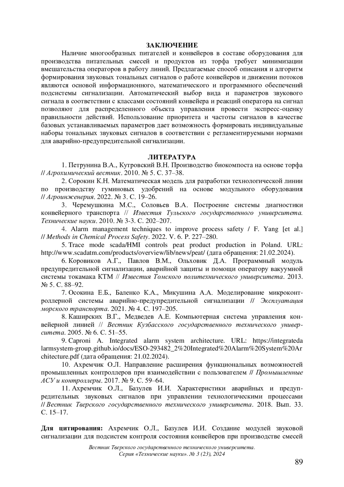 11. 	Ахремчик О.Л., Базулев И.И. Характеристики аварийных и предупредительных звуковых сигналов при управлении технологическими процессами // Вестник Тверского государственного технического университета. 2018. Вып. 33. С. 15-17.