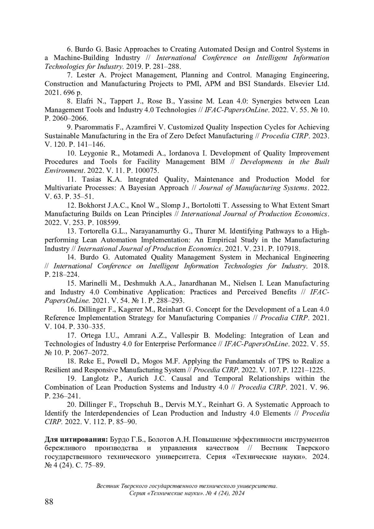 14. 	Burdo G. Automated Quality Management System in Mechanical Engineering // International Conference on Intelligent Information Technologies for Industry. 2018. P. 218-224.