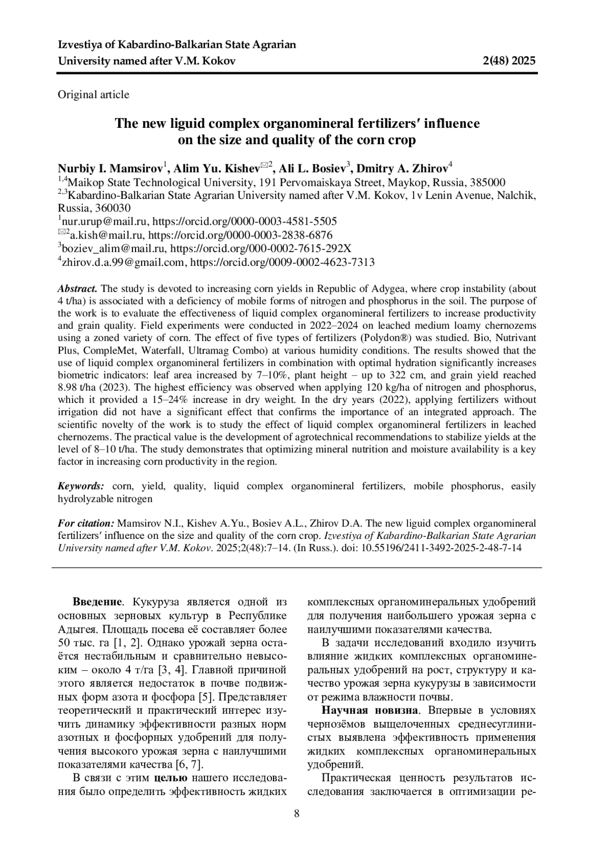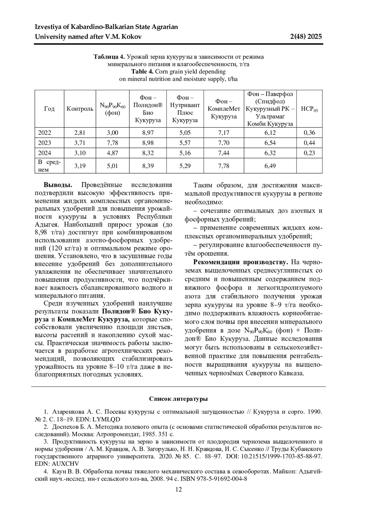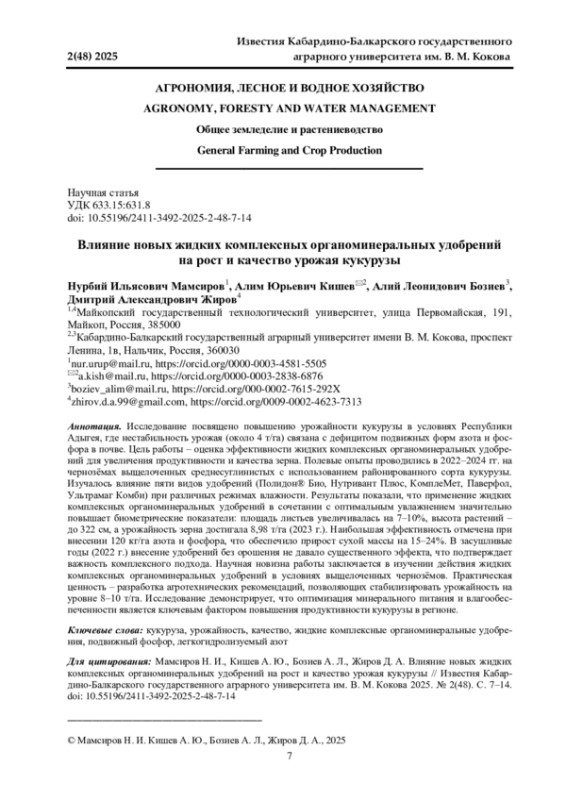 Исследование посвящено повышению урожайности кукурузы в условиях Республики Адыгея, где нестабильность урожая (около 4 т/га) связана с дефицитом подвижных форм азота и фосфора в почве. Цель работы - оценка эффективности жидких комплексных органоминеральных удобрений для увеличения продуктивности и качества зерна. Полевые опыты проводились в 2022-2024 гг. на чернозѐмах выщелоченных среднесуглинистых с использованием районированного сорта кукурузы. Изучалось влияние пяти видов удобрений (Полидон® Био, Нутривант Плюс, КомплеМет, Паверфол, Ультрамаг Комби) при различных режимах влажности. Результаты показали, что применение жидких комплексных органоминеральных удобрений в сочетании с оптимальным увлажнением значительно повышает биометрические показатели: площадь листьев увеличивалась на 7-10%, высота растений - до 322 см, а урожайность зерна достигала 8,98 т/га (2023 г.). Наибольшая эффективность отмечена при внесении 120 кг/га азота и фосфора, что обеспечило прирост сухой массы на 15-24%. В засушливые годы (2022 г.) внесение удобрений без орошения не давало существенного эффекта, что подтверждает важность комплексного подхода. Научная новизна работы заключается в изучении действия жидких комплексных органоминеральных удобрений в условиях выщелоченных чернозѐмов. Практическая ценность - разработка агротехнических рекомендаций, позволяющих стабилизировать урожайность на уровне 8-10 т/га. Исследование демонстрирует, что оптимизация минерального питания и влагообеспеченности является ключевым фактором повышения продуктивности кукурузы в регионе.