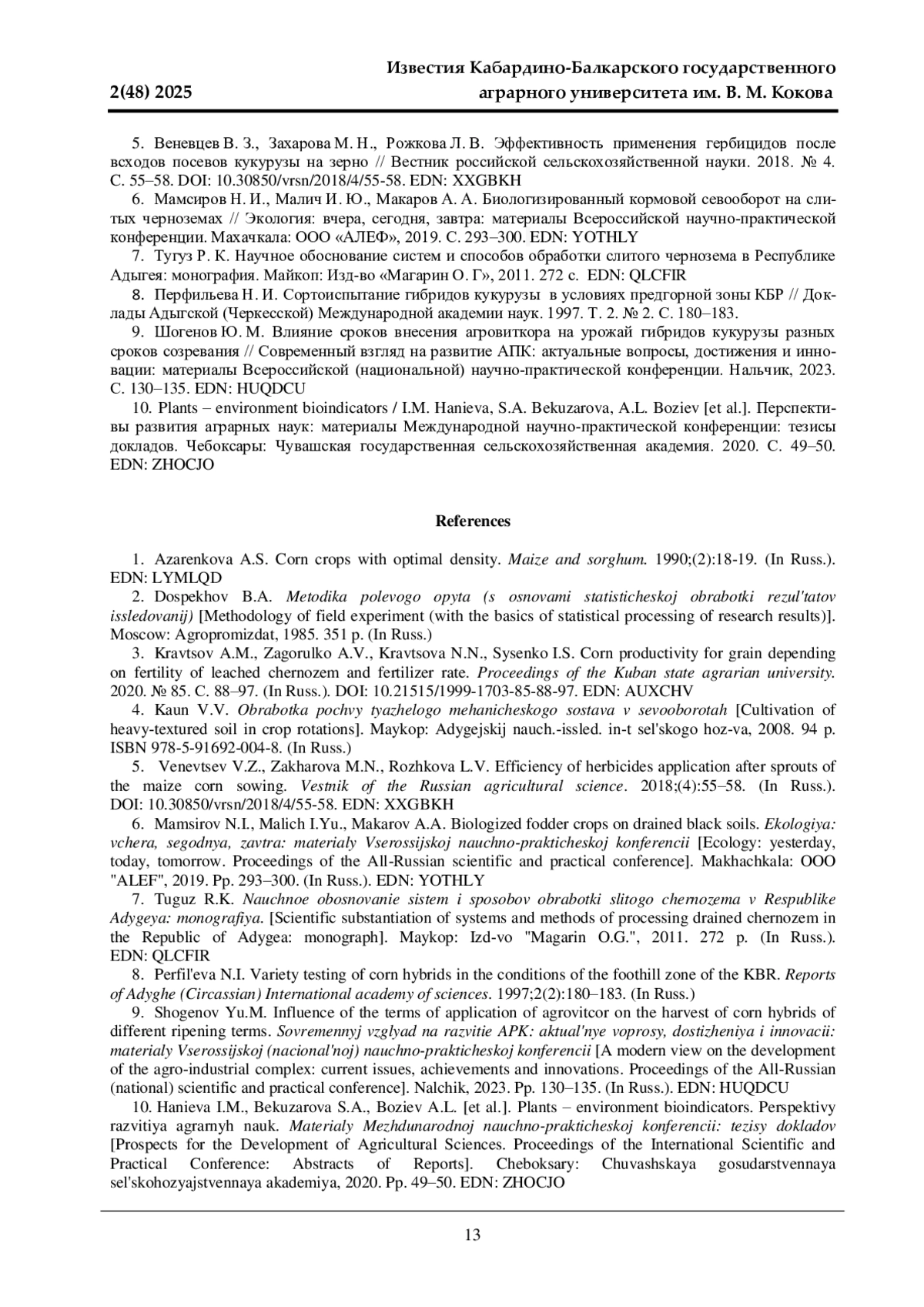 9. Шогенов Ю. М. Влияние сроков внесения агровиткора на урожай гибридов кукурузы разных сроков созревания // Современный взгляд на развитие АПК: актуальные вопросы, достижения и инновации: материалы Всероссийской (национальной) научно-практической конференции. Нальчик, 2023. С. 130-135. EDN: HUQDCU
