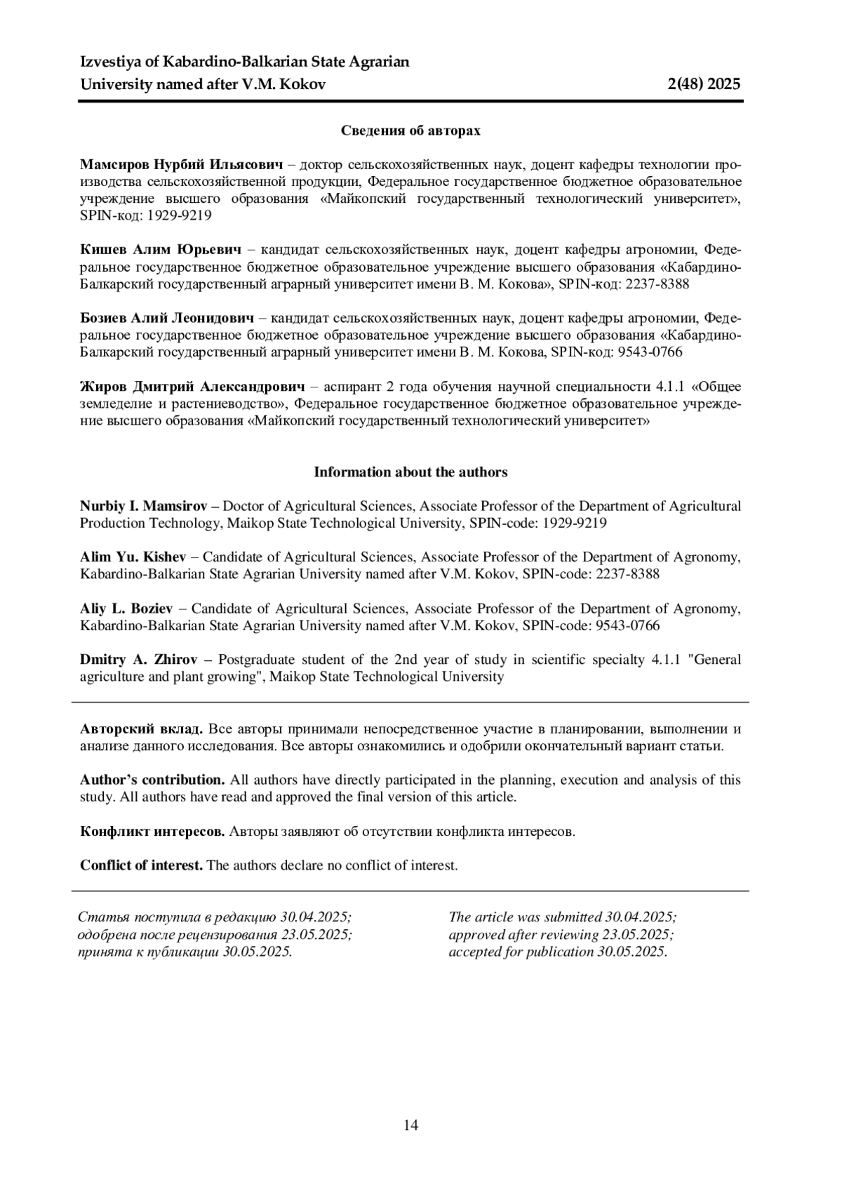6. Мамсиров Н. И., Малич И. Ю., Макаров А. А. Биологизированный кормовой севооборот на слитых черноземах // Экология: вчера, сегодня, завтра: материалы Всероссийской научно-практической конференции. Махачкала: ООО “АЛЕФ”, 2019. С. EDN: YOTHLY