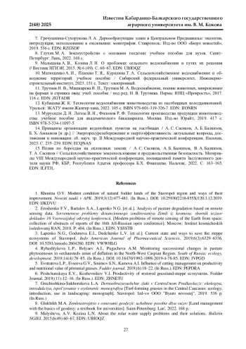 1. Хонина О. В. Современное состояние естественных кормовых угодий Ставрополья и способы их улучшения // Новости науки в АПК. 2019. № 3 (12). С. 477-481. DOI: 10.25930/2218-855X/120.3.12.2019 EDN: IJKDVU